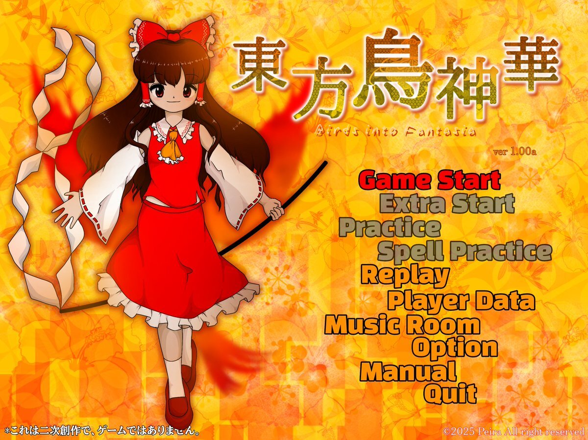 「東方鳥神華 ~ Bird into Fantasia」 (とうほうちょうしんか) のタイトルを作ってみました ちゃんとした体験版の公開は…12月7日です!お楽しみに! #東方二次創作 #ZUN絵風 #ZUN絵 #博麗靈夢 #東方鳥神華 pic.x.com/pi5tmES3Ca