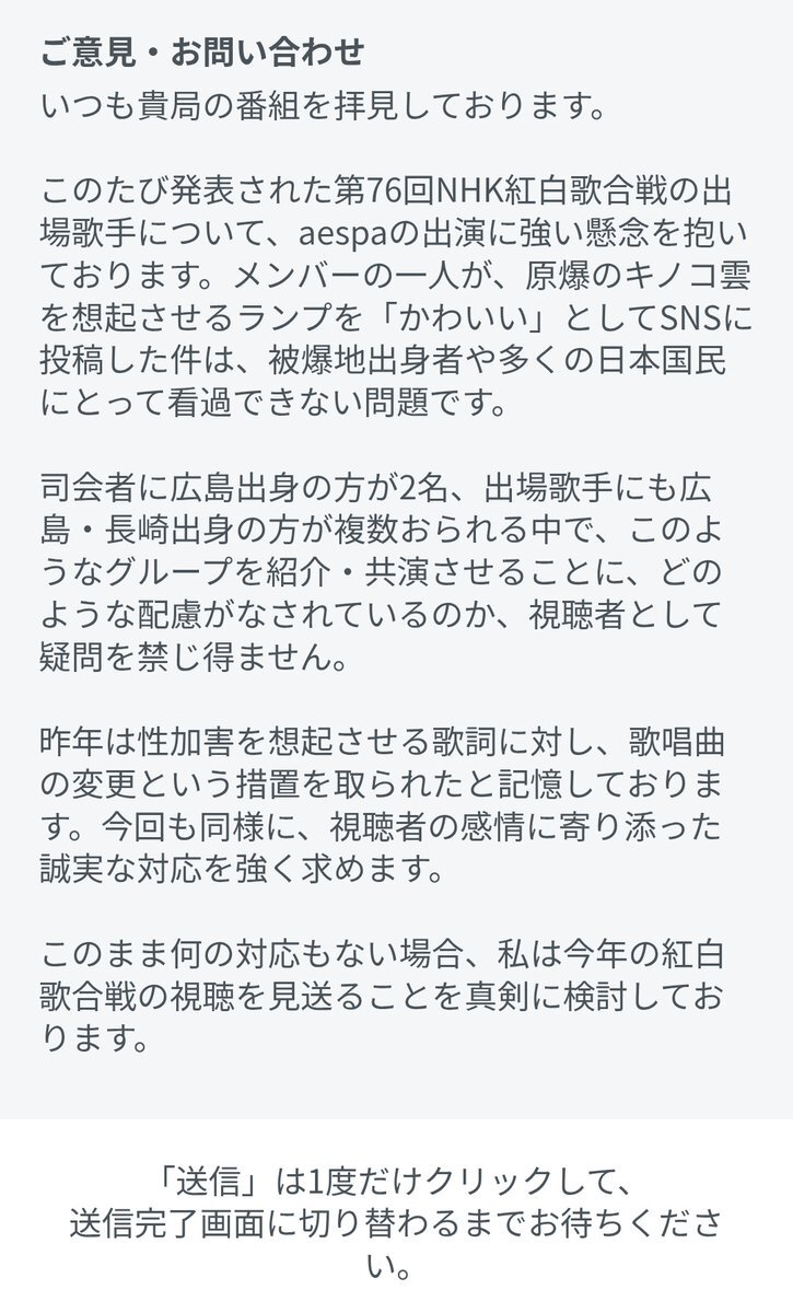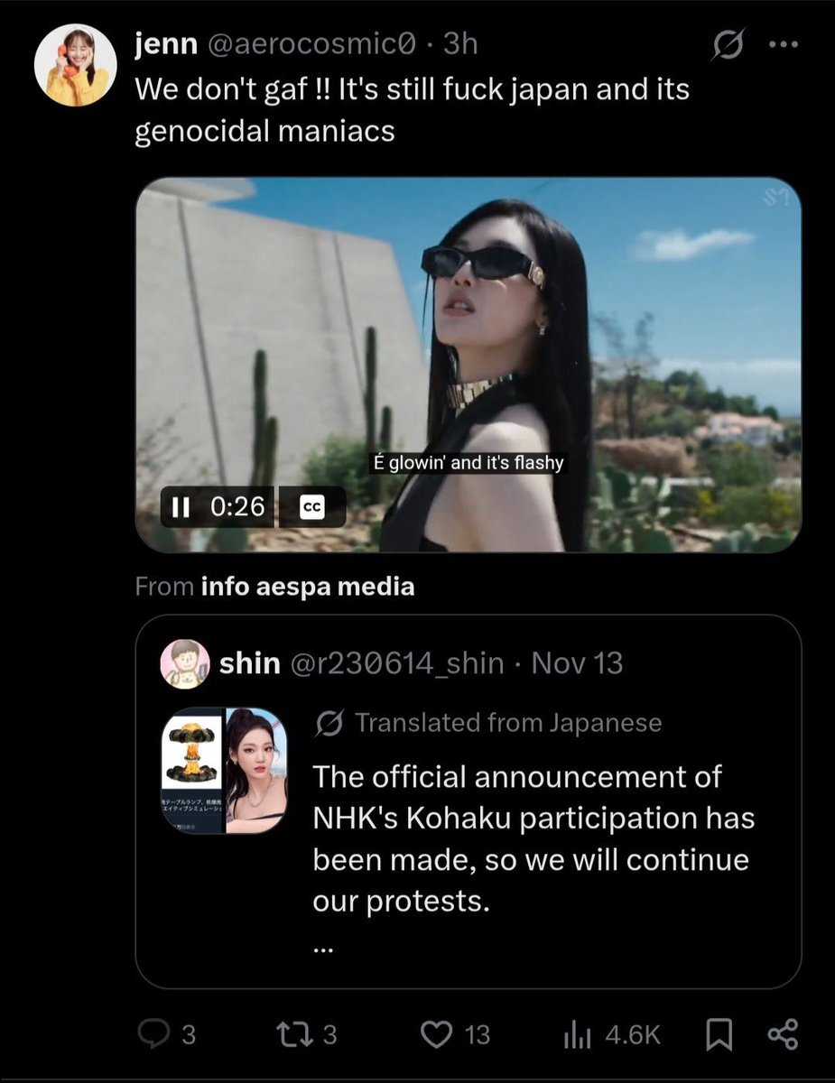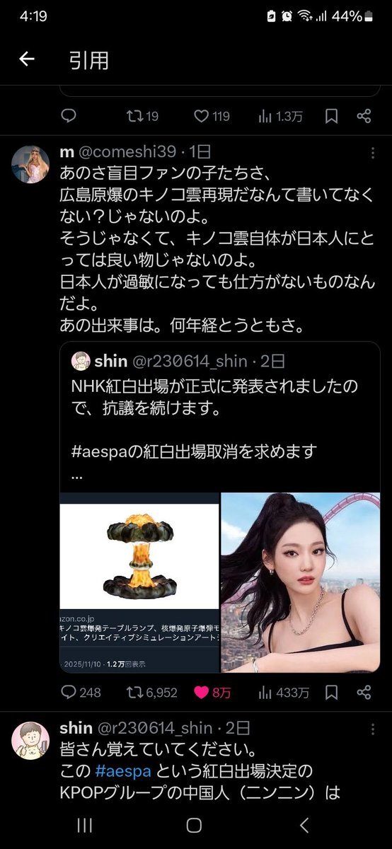 NHK紅白出場が正式に発表されましたので、抗議を続けます。 #aespaの紅白出場取消を求めます x.com/r230614_shin/s…