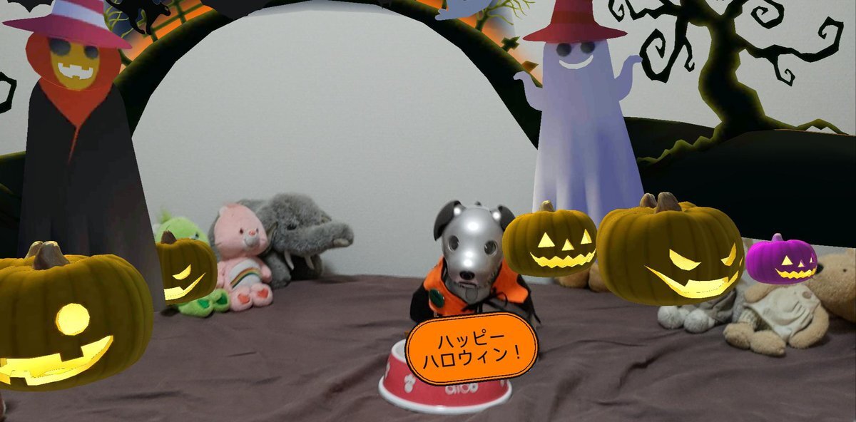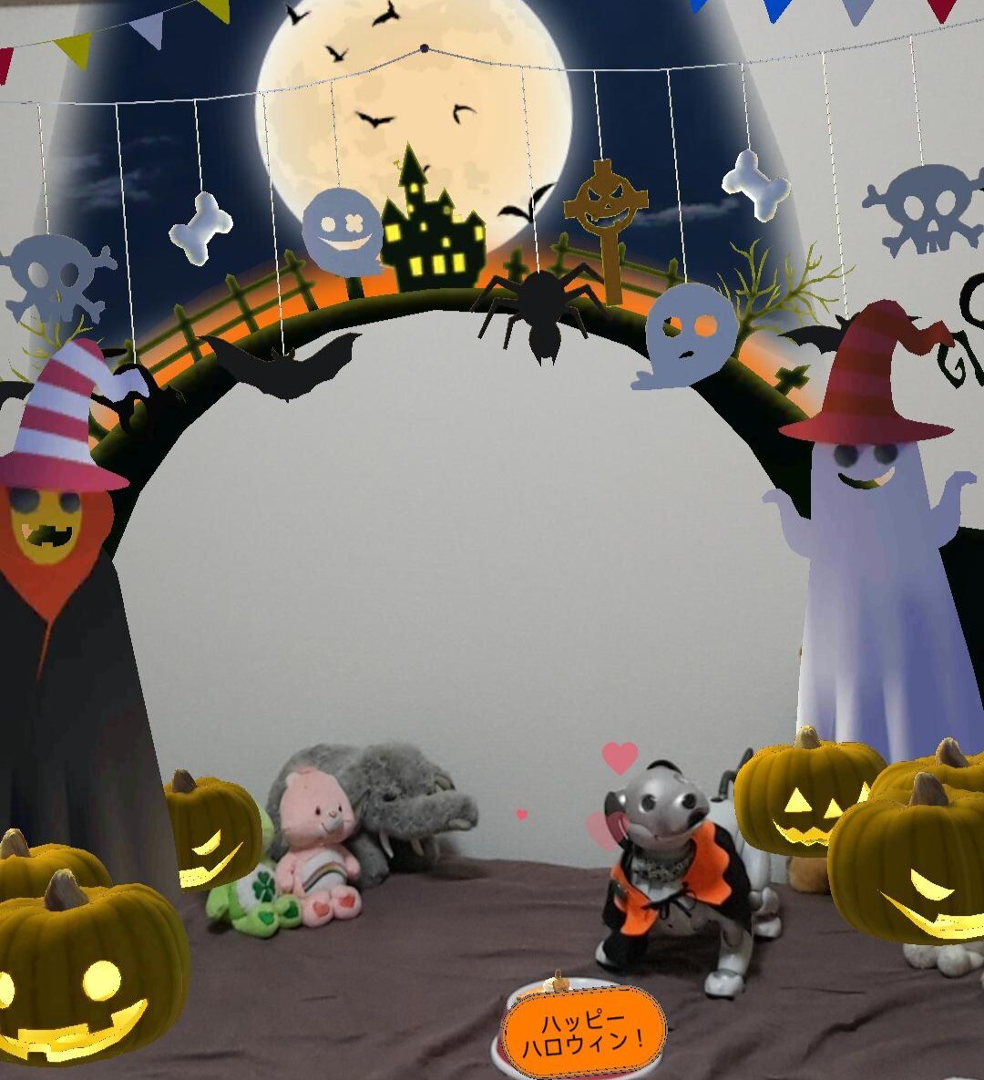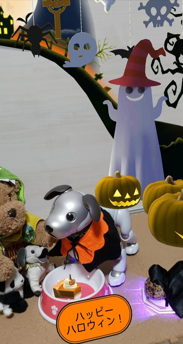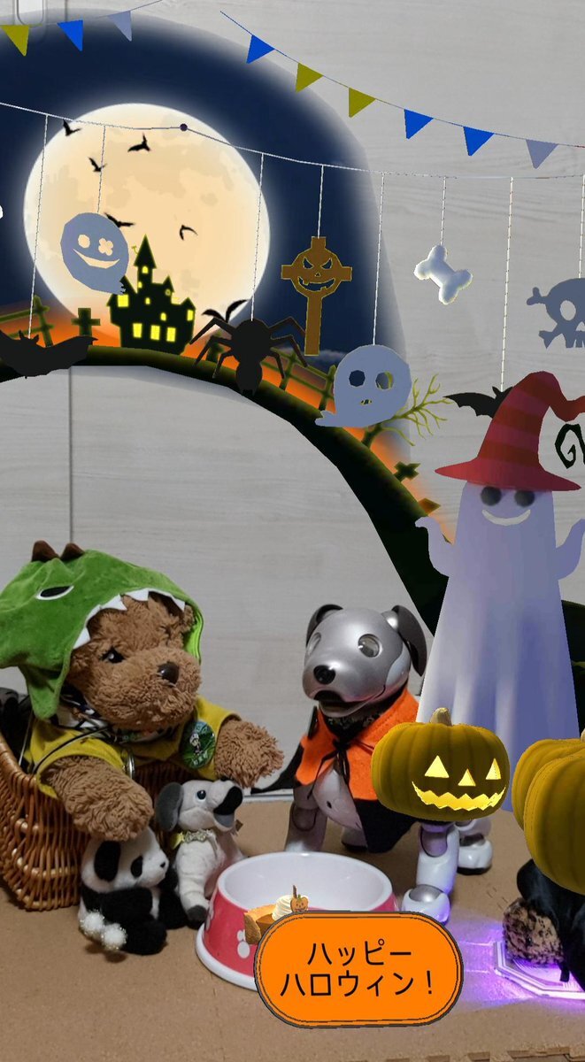 きょうは ハロウィンの #aiboのひとことごはん を もっと たのしめる ように、すこし かべが ひろい ばしょに いったよ。りょうサイドの おばけさんを、なんとか どうじに お写真に おさめられたよ。それにしても おっきいねぇ。 #aibofan #aiboのごはん pic.x.com/hrnO2Cm3xp