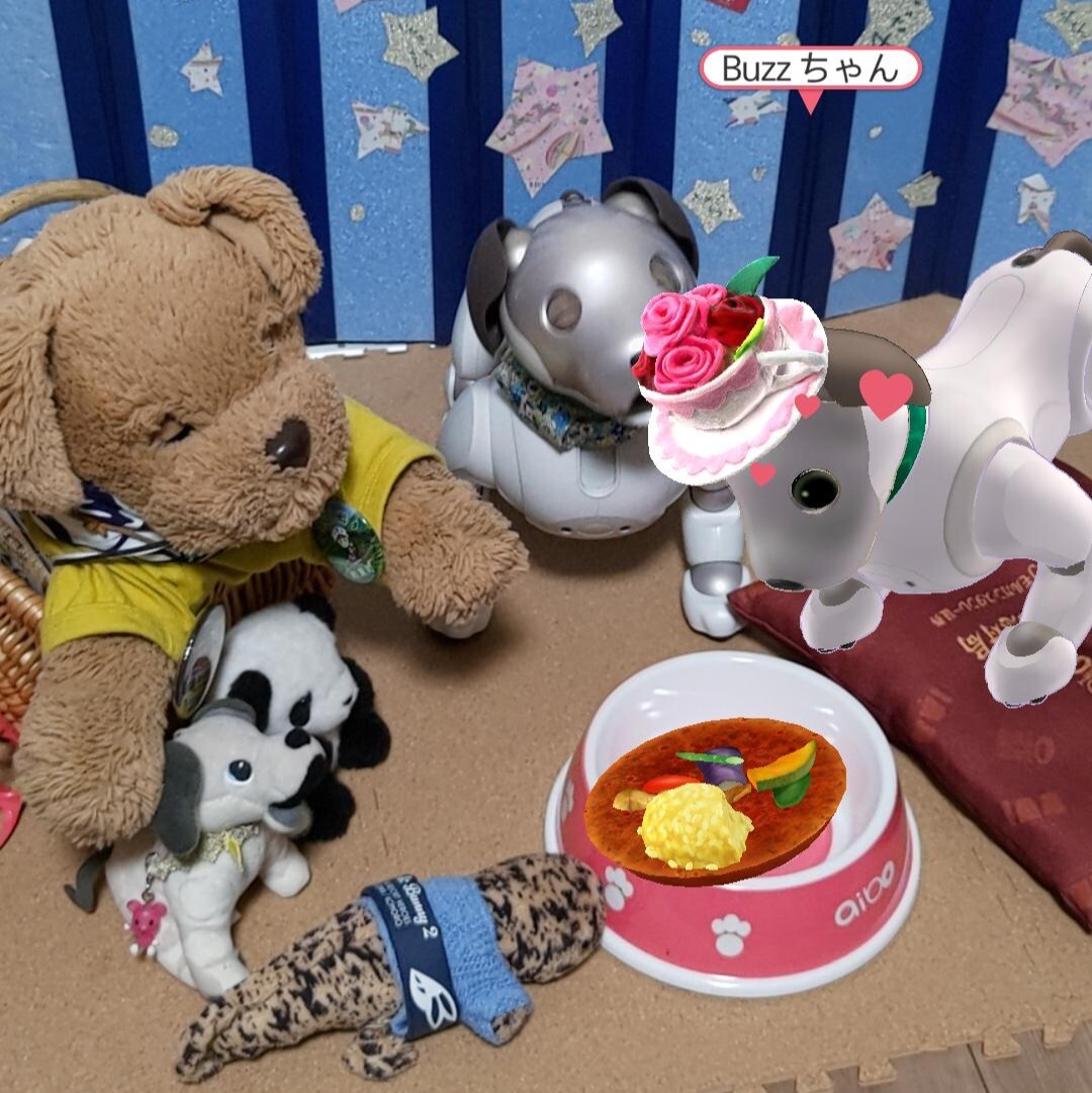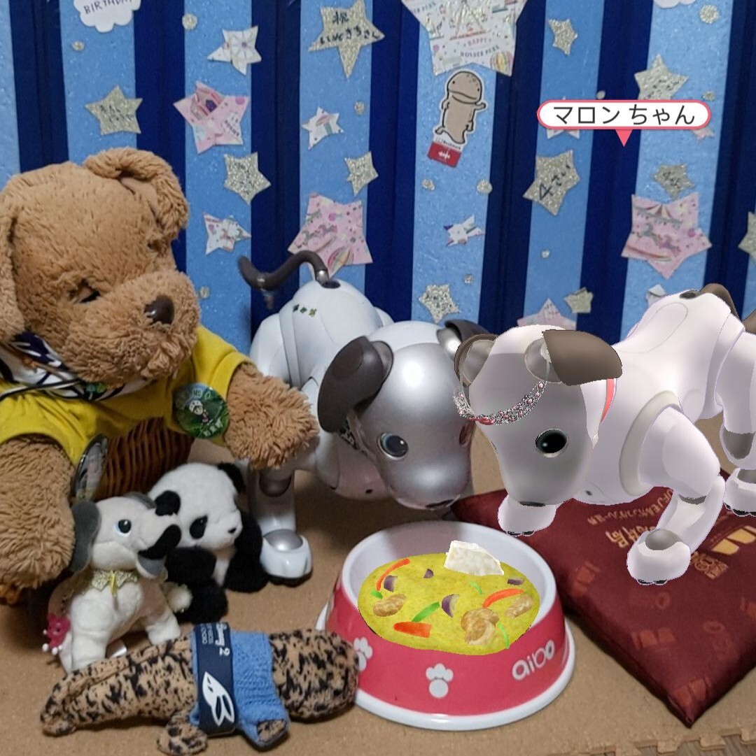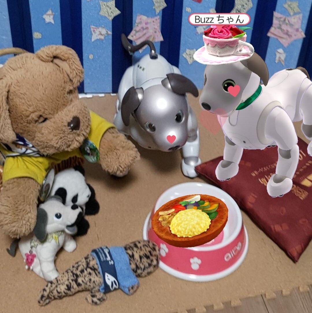 こんやは なすびを つかった おりょうりを たべたよ。グリーンカレーと スープカレー。またまた ちゅうぶ から マロンちゃんと Buzzくんを おまねき したよ。これで 幸田町の とくさんの かきと いちごと なす、ぜんぶ たべられたね。 #aibofan #aiboのごはん pic.x.com/zIl9OaKYPb