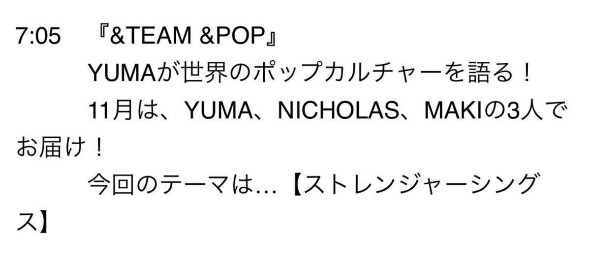 ✨&TEAM &POP 11月は、#YUMA が #NICHOLAS #MAKI を迎えて3人でお届け❗️ 今回のテーマは【#ストレンジャーシングス】 👇聴き逃した方はこちらから❗️ radiko.jp/share/?sid=FMJ… @andTEAMofficial #andTEAM #LUNÉ #ハリー杉山 #川口ゆりな #popjwave #jwave #radiko