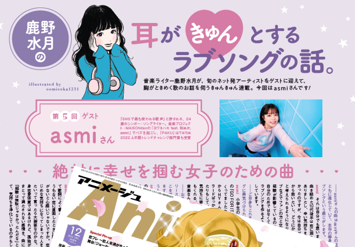 【アニメージュ12月号/絶賛発売中】 「耳きゅん」連載の5回目は、SNSで最も使われる歌声と評されるasmiさんが登場です。ご自身の恋愛観や、ラブソングに込めている想い、そして、恋に悩んだら絶対に聴いてほしい曲など、たっぷりお話を伺いました! #鹿野水月 #asmi pic.x.com/MIE7DXzm4K