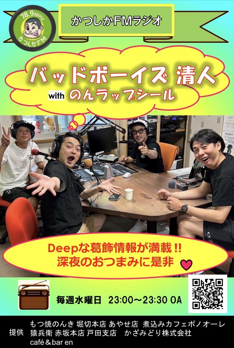 本日です📻🎶 かつしかFMラジオ 『バッドボーイズ清人with のんラップシール 』 毎週水曜 23:00〜23:30 🛑スマホやパソコンでも聴けます⬇️ kfm789.co.jp/kikikata 🛑質問・お便りの投稿✒️⬇️ @GOdcMRYaT6cX58d または kfm789.co.jp/contact/ 🛑スポンサー様いつでも募集中⬇️ @atsutaro1