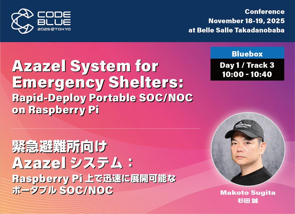 🚀CODE BLUE 2025 講演紹介 #10 📢『緊急避難所向けAzazelシステム:Raspberry Pi上で迅速に展開可能なポータブルSOC/NOC』 🗣️ 杉田 誠 codeblue.jp/program/time-t…