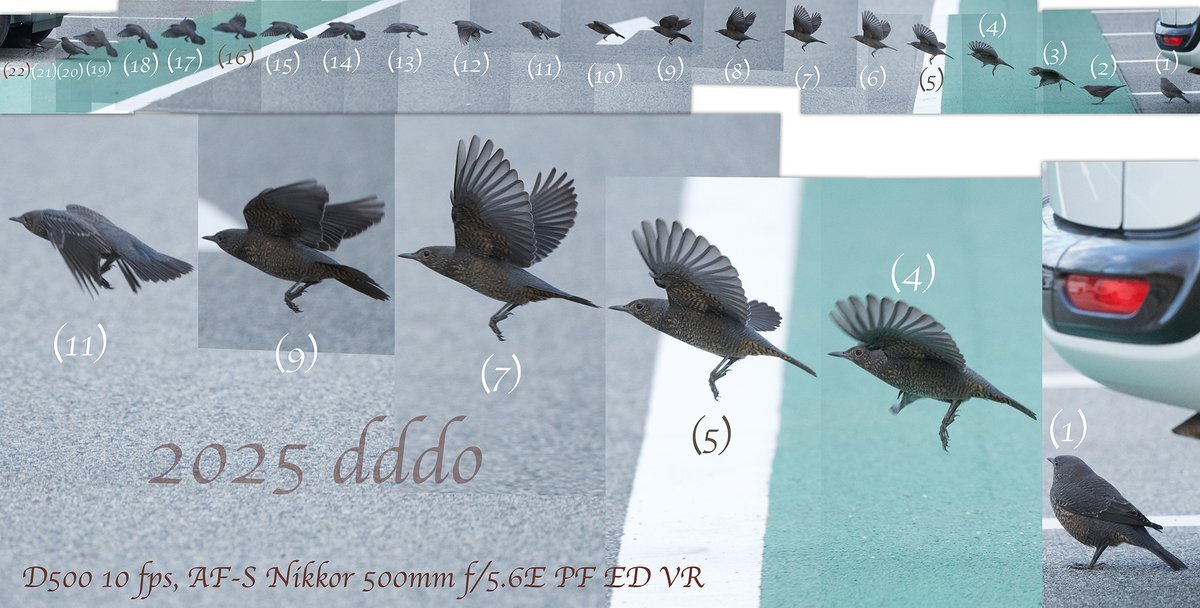#イソヒヨドリ メスはその後のんびり(*)飛行して別の車の下に採餌に^^ 10コマ/秒の22コマ、上段は飛行経路のわかる合成、下段はピントの合っているのを大きめに *) 離陸後も加速せず(コマ間の距離が開かず)に飛行 2025.10.20 #宝塚北SA #D500 #500mmF56Epf #blueRockThrush #bird #flight #photo pic.x.com/gCSn5oUxks