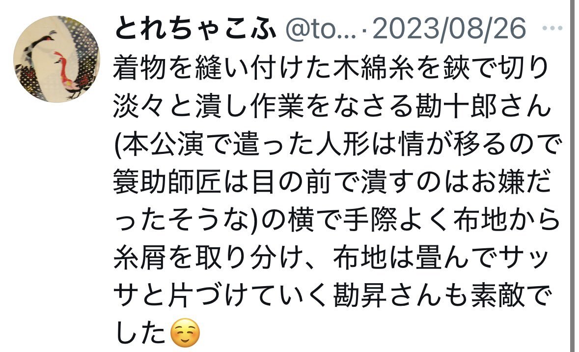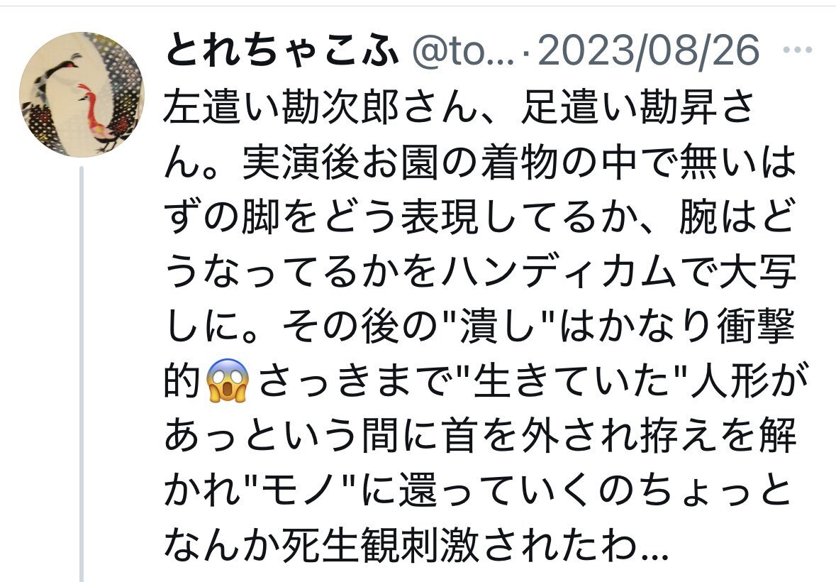 日本凱旋公演 #BUNRAKU キャンベルさん、寛太郎さんがお話していたアメリカ公演終演後の人形解体ショー(?)、賛否両論というか何故ここまで見せる?って言われたらしい。ごもっともです。あれ本当にショックだもん😨さっきまで"生きていた"人形がバラされていくの… pic.x.com/JARWelGLmp