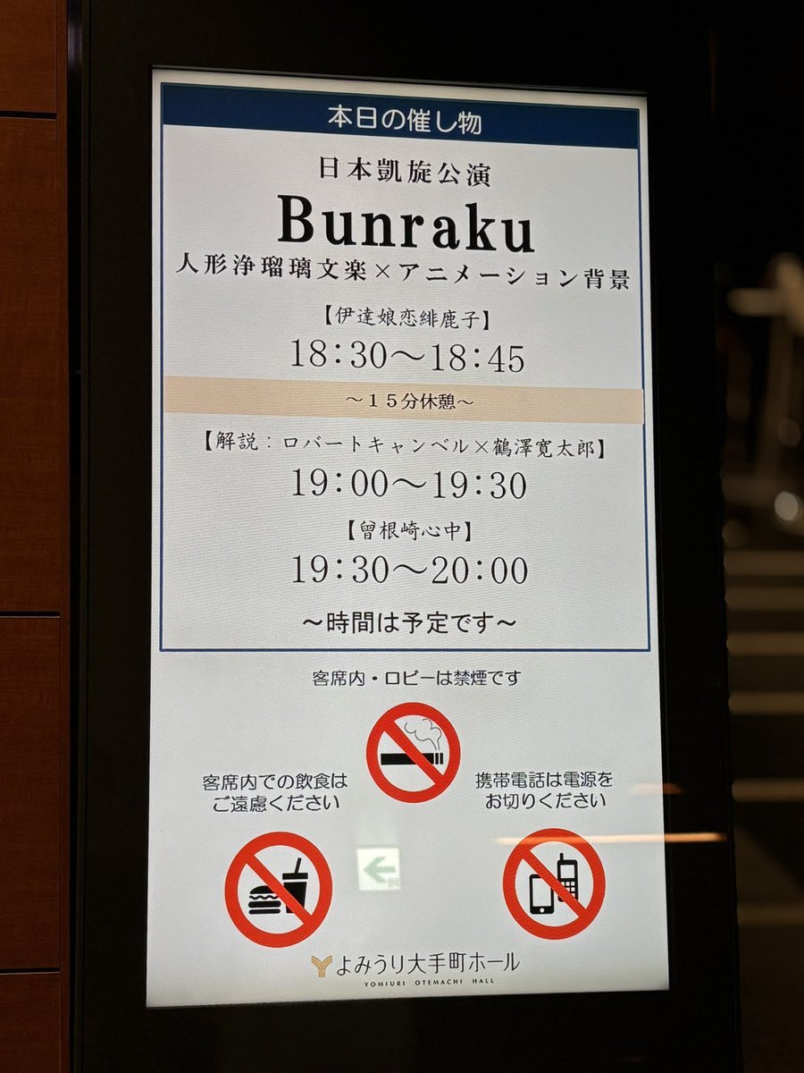 今日は、#よみうり大手町ホール#Bunraku 人形浄瑠璃文楽✖️アニメーション背景。 楽しみである。