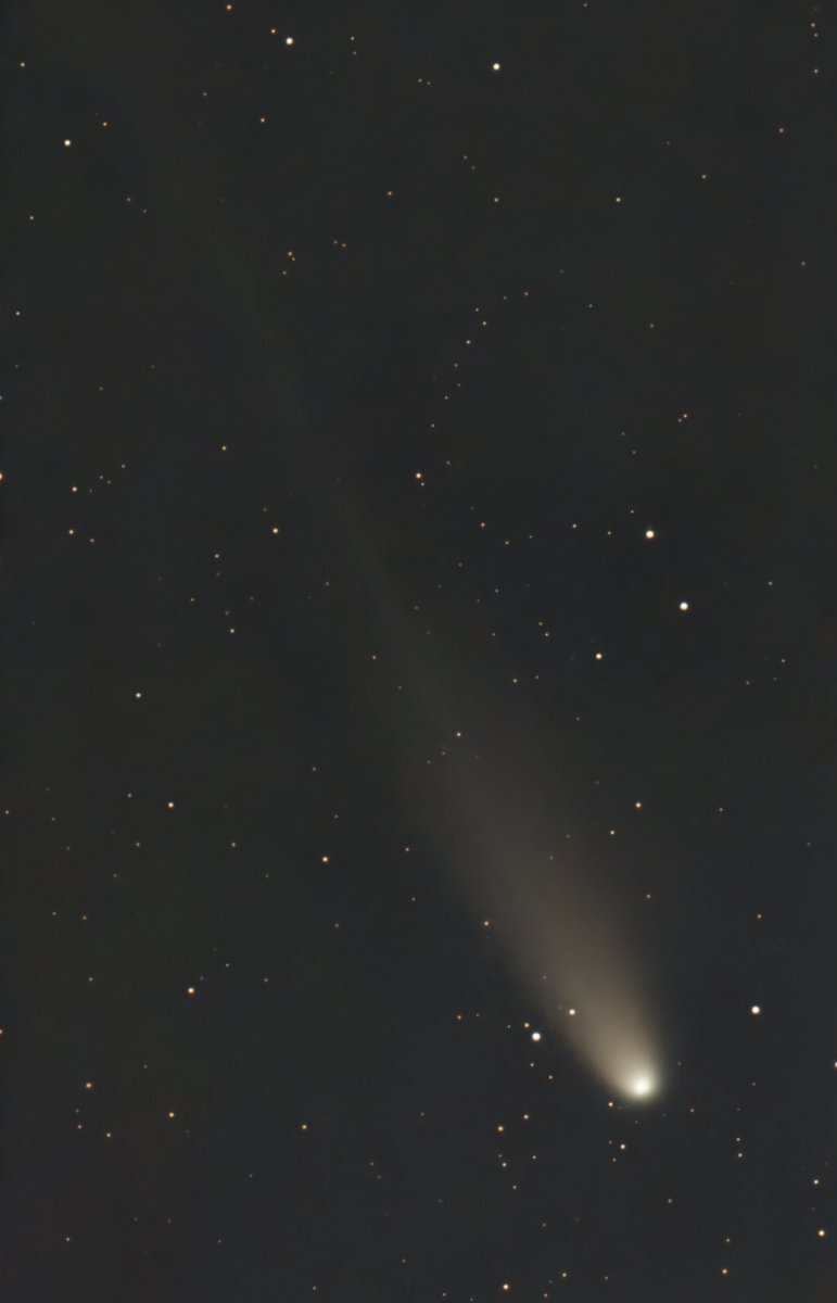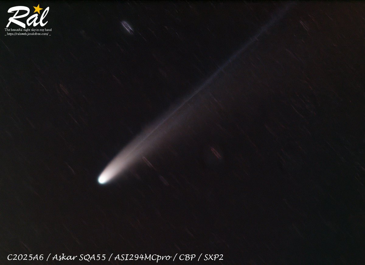取り急ぎ、さくさく~っと画像処理。20秒 x 46枚コンポジット。口径 3cm の #Seestar S30 でも、イオンとダストの尾が分離して写ってくれますねぇ。ちなみに途中、電柱の襲撃を受けて枚数はあまり稼げずorz #レモン彗星 #C2025A6 pic.x.com/nKgOhF6FZz x.com/siriusb_wd/sta…