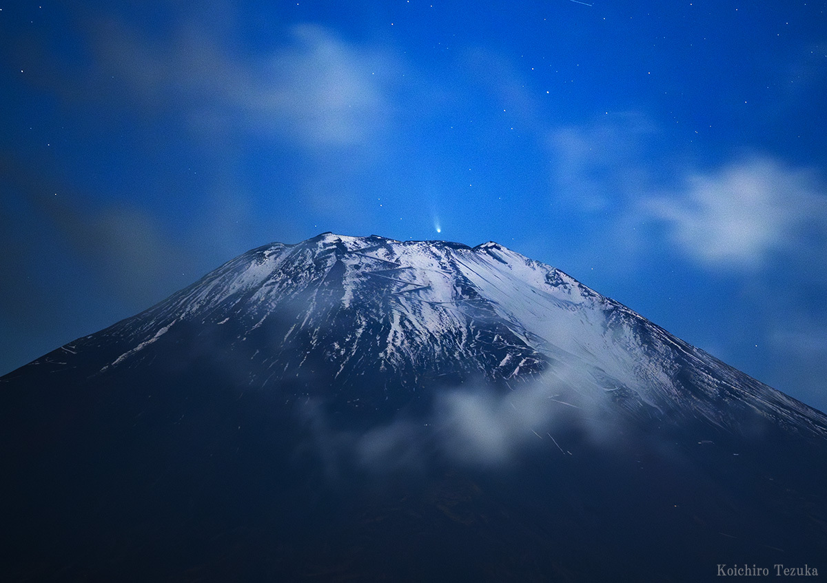 今日のレモン彗星、富士山頂に沈んでいきました。彗星は明日が太陽に最接近する「近日点通過」。今後は次第に明るさも暗くなり、夕空での高度も下がっていくので、見納めが近づいてきました。 2025/11/7 18:24 (1枚撮り) #レモン彗星 #c2025a6 #富士山 #山中湖村