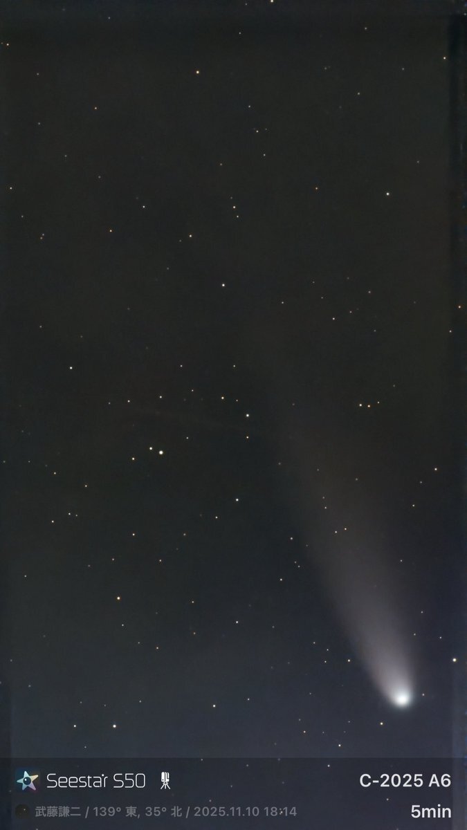 25.11.5 17:35 #レモン彗星 200mmで撮影、撮って出しです。 何枚か撮れたのでSequatorで処理すると見栄えよくなるのでしょうか? 薄明と月で肉眼では見えていません。 今日はDWARF3のデータが飛んでました…最近やらかしてます…🫠 今日もお疲れ様でした。 お休みなさい。 #C2025A6 #むかわ町穂別 pic.x.com/aoOtf3P6c8