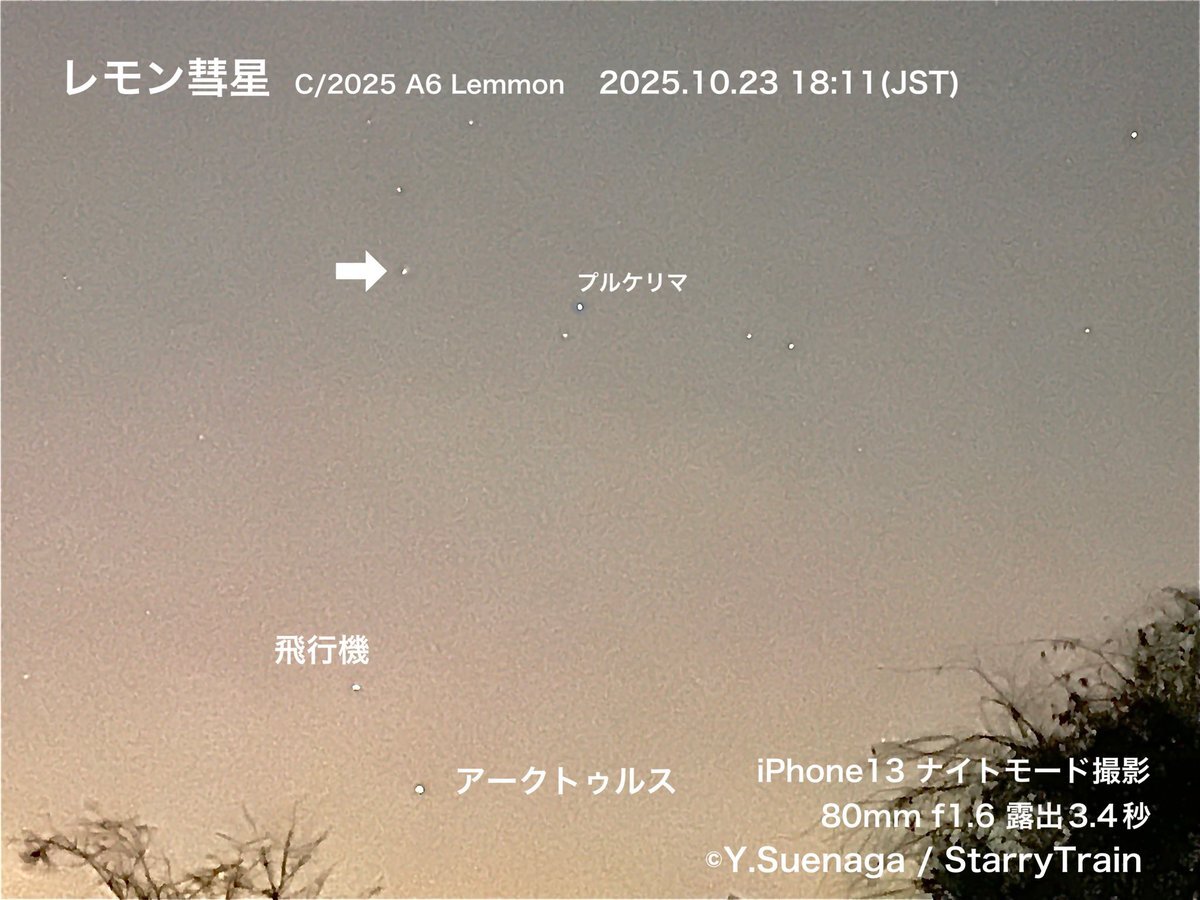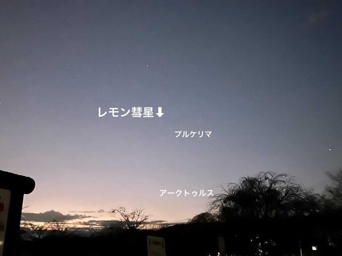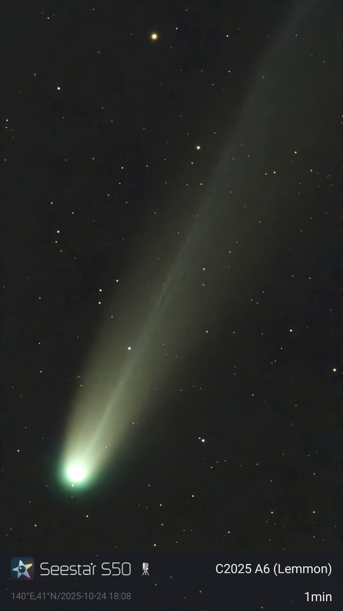 派遣仕事が早く終わったので勤務先から車で10分弱の観測地へ💨 望遠鏡も双眼鏡もカメラも防寒着も用意がないまま、スマホ撮影チャレンジ。 2025.10.23 18:02(JST) iPhone13のナイトモード撮影 露出3秒で彗星の位置は確認できます 撮影地 富士宮市 #c2025a6 #c2025a6lemmon #レモン彗星 pic.x.com/EiyRPCs9xE