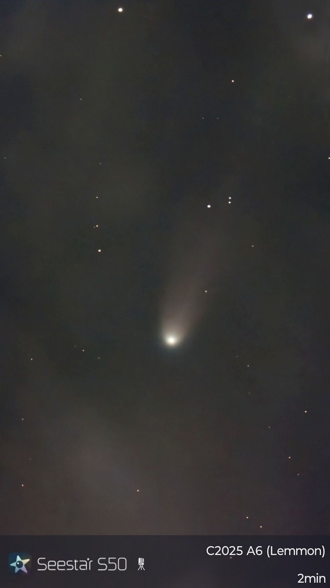 レモン彗星、眼視もしました。KenkoSE120とアストロスキャン、どちらもしっかり彗星とその尾が確認出来ました。写真はコリメート撮影。#スマホ写真部 #C2025A6lemmon #Xperia1V pic.x.com/mM74Pi6Y8f