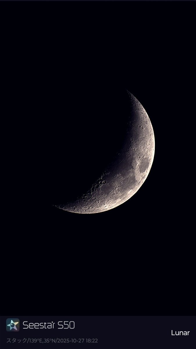 白い雲間に見せた月齢5.9および彗星C/2025 A6 Lemmon。彗星 は12フレーム取得後、雲で消えました、その中から雲の少ない7枚を選択し本体内部スタック。2025/10/27 #月:18:22 #彗星:18:33~18:35撮影 #SeestarS50 #C2025A6Lemmon pic.x.com/G3xkPhDOt4