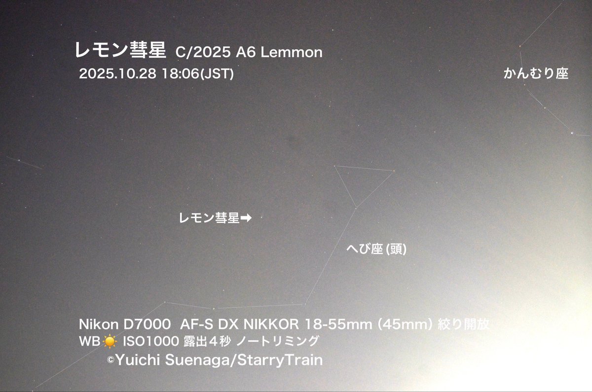 レモン狩り (2025.10.30 18:21) レモン彗星 C/2025 A6 (Lemmon) の取って出し(ワンショット)です。 自宅から車で約30分くらいのところにて、お天気下り坂の前に月齢 8.9の月明かりの中、撮影した1枚です。 #レモン彗星 #C2025A6Lemmon pic.x.com/nYaVs6RKn4