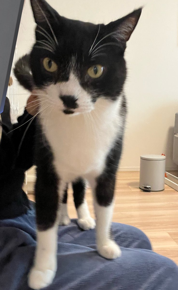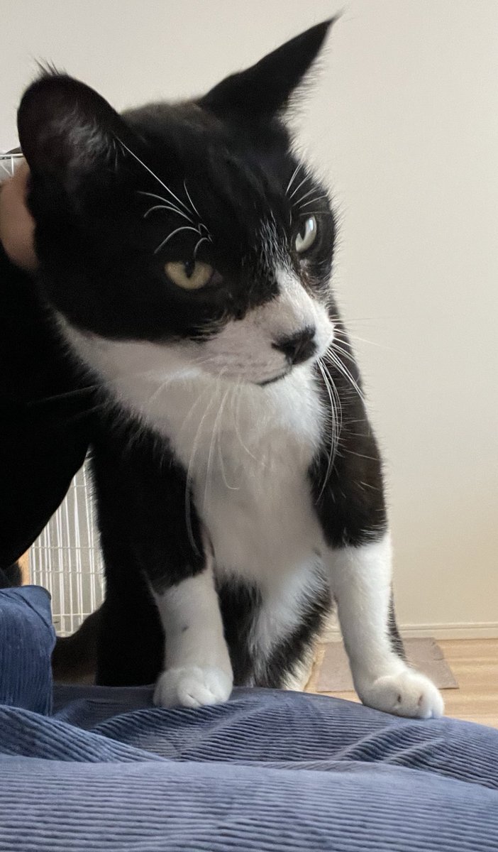 出かけようとしている人の膝の上に乗って撫でを要求している有です # #猫のいる暮らし #ハチワレ #CatsOfTwitter #猫の有くん 撫でじゃなくて掻きかも pic.x.com/rdxeMCaWWj