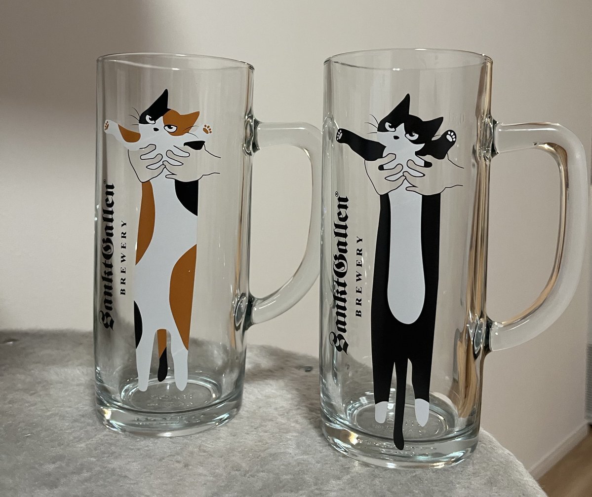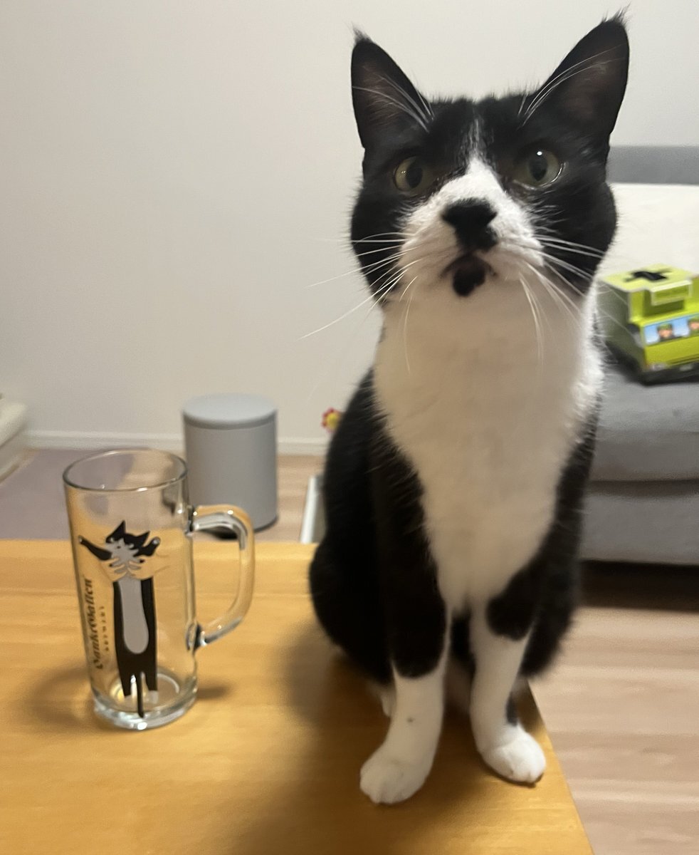 サンクトガーレンの猫ジョッキを入手してきました!🍺 そっくりなジョッキを横に、有もドヤ顔をしています😎 # #猫のいる暮らし #ハチワレ #CatsOfTwitter #猫の有くん pic.x.com/gSKExXkLsM