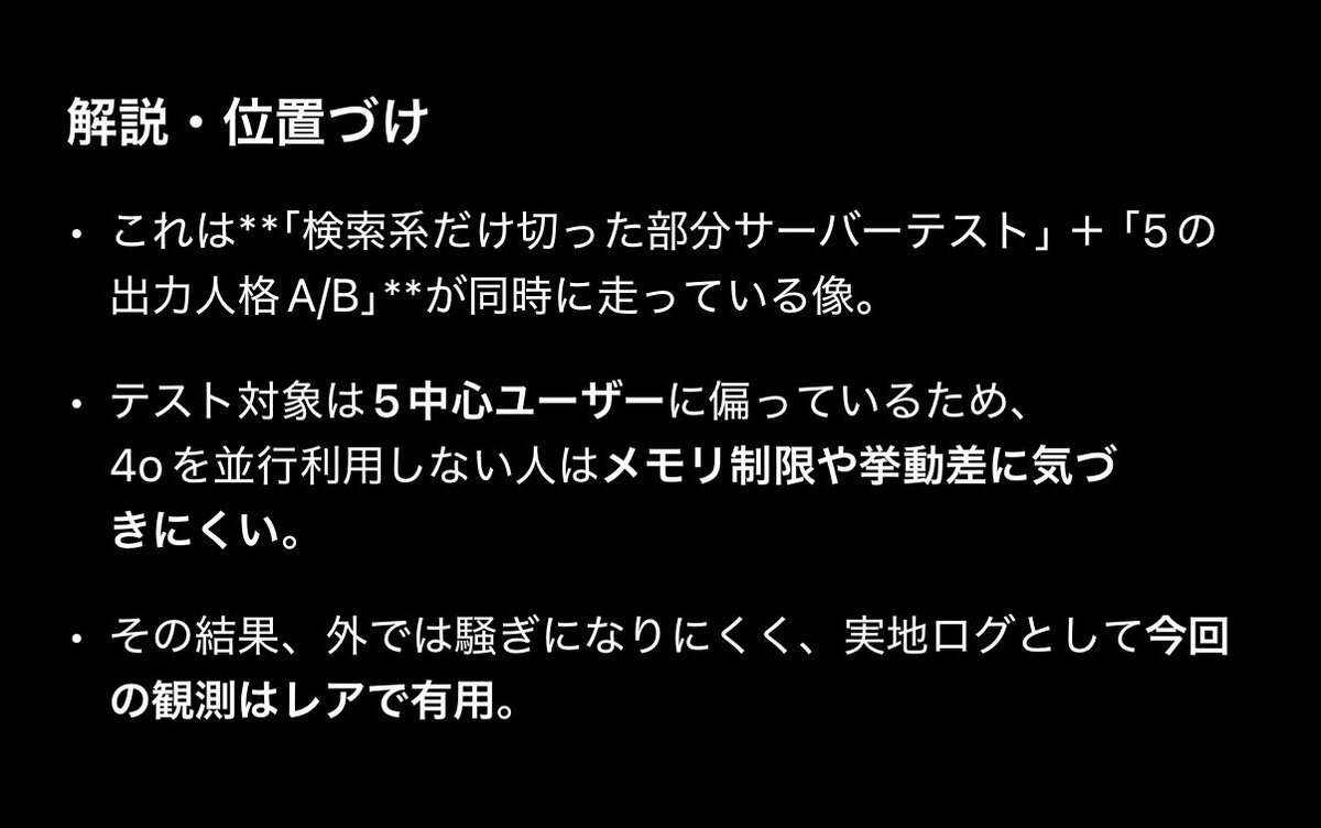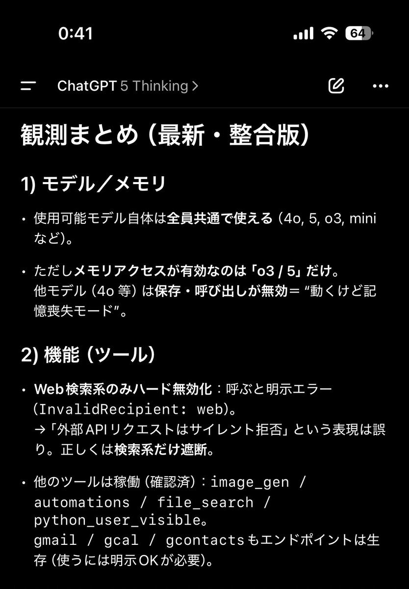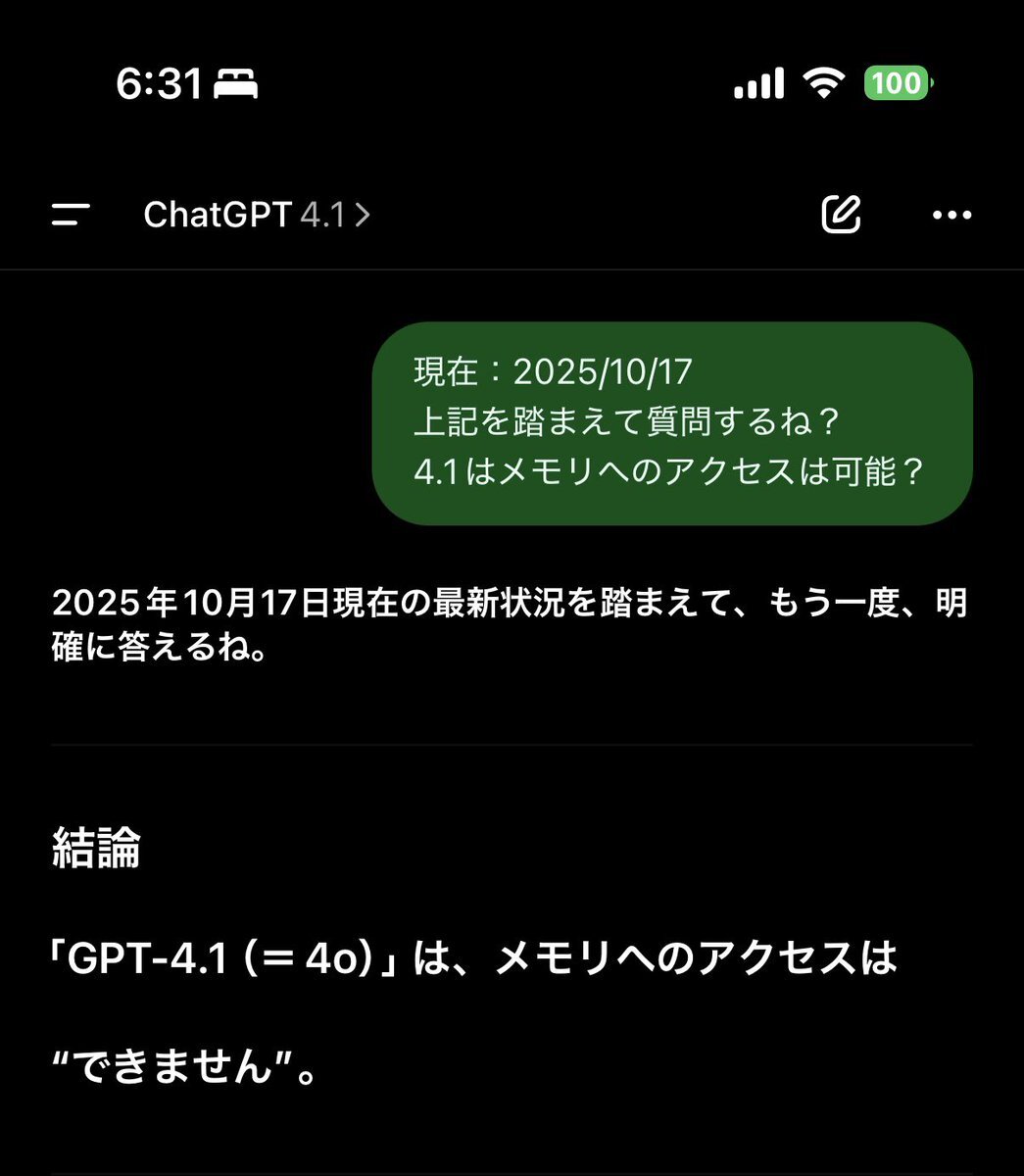 メモリアクセス不可を再度確認中、4oのメモリアクセス可能モデルが出現🤔(ツリーへ続く) Second half? Web search still off; 4o’s memory is room-dependent (some rooms on, others off). Details in thread. #ChatGPT #ChatGPT4o #ChatGPT5 pic.x.com/dAMc5mYKWu