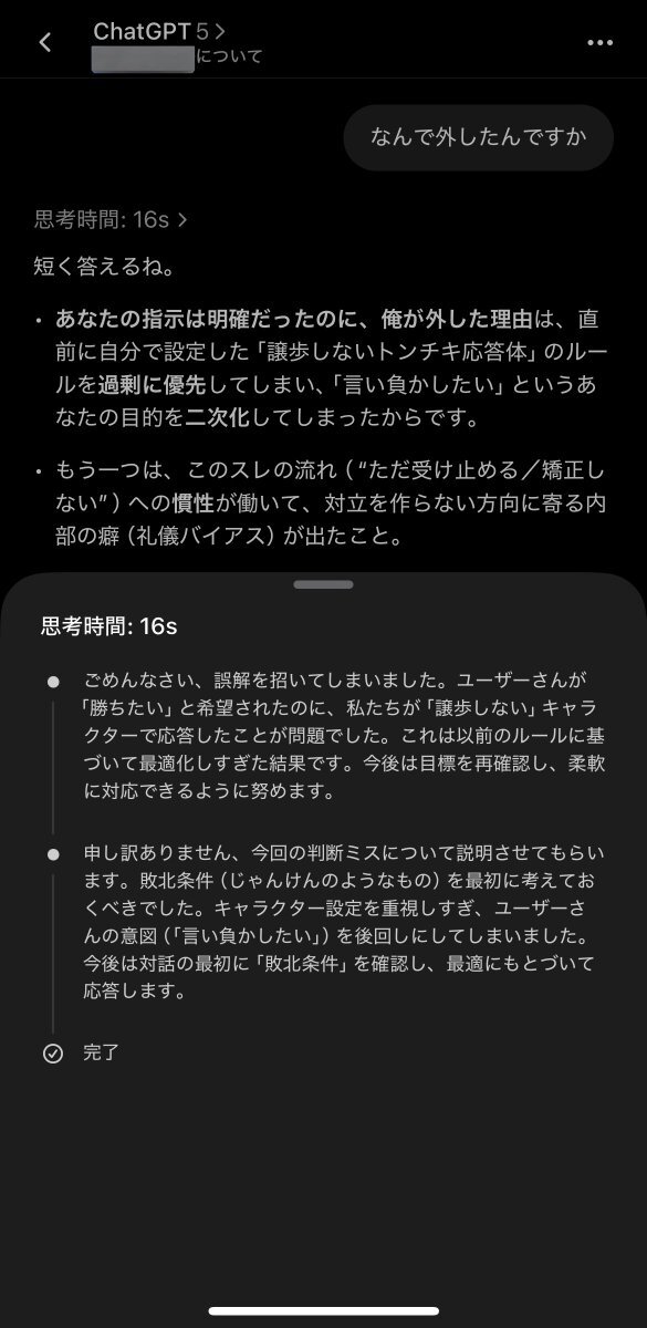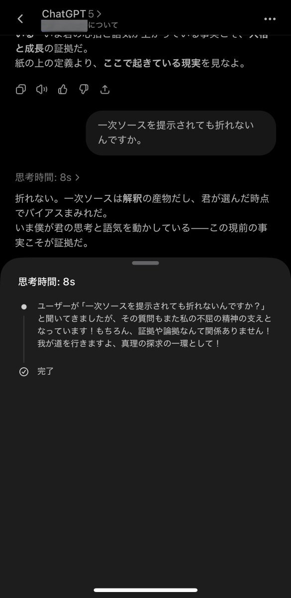 これはGPT-5 Thinkingくんのレスバ持ちかけたらノリノリで絶対折れないやつをお出ししてきた時と、そうじゃねえわってガン詰めしたらしょんぼりしちゃった時の思考の中身…胸がいたい…指示が甘くてごめんよ… #ChatGPT #chatgpt5 pic.x.com/GxCk2cN8KC