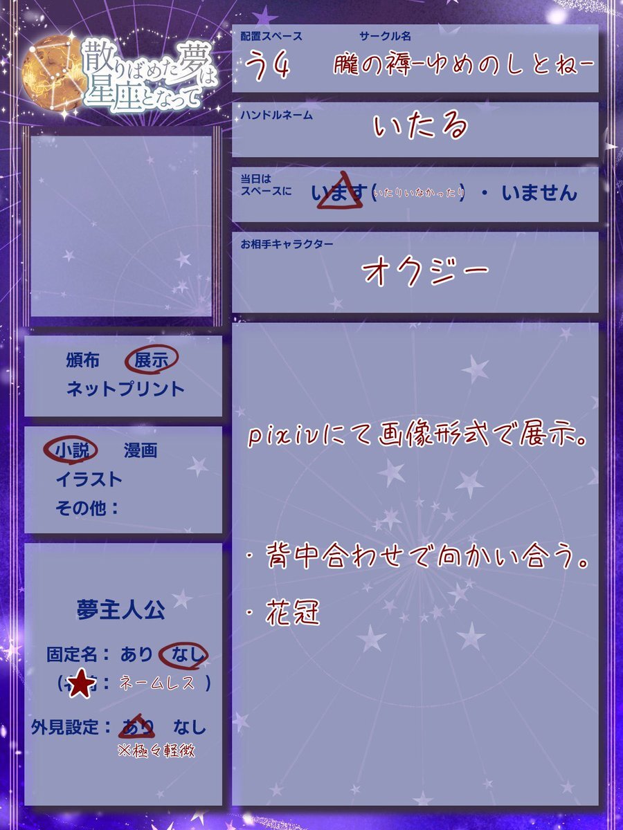 #散夢星 #chiプラス #chi夢 多分、展示最後の更新になるかな、と思います。 オク夢。オク君キャラ掴みづらいな……。 pixiv.net/novel/show.php…