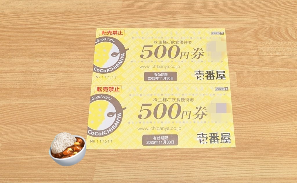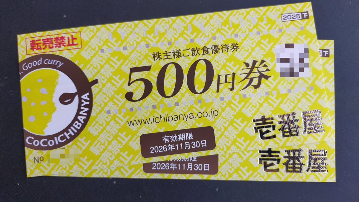 #壱番屋 7630 #株主優待 到着! 100株なので、500円券 × 2枚 = 1000円分 の優待券です。 #CoCo壱番屋 で使いますけど、今月末期限の優待券がまだ使えておりませんで。(^_^; pic.x.com/cvE08DsjSk