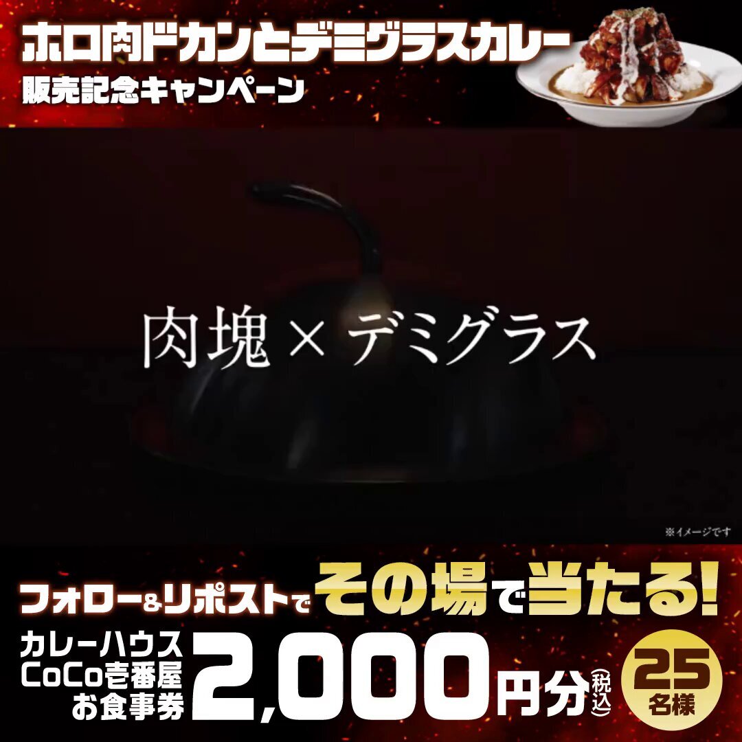 / ホロ肉ドカンとデミグラスカレー販売記念キャンペーン🍛 \ お食事券2,000円分(税込)が25名様に当たります🎁 1⃣@curryichibanyaをフォロー 2⃣本投稿を11/25 10:59迄にリポスト🔃 3⃣当選者にDM送付✉ 規約はこちら▼ cms.echoes.plus/contents/cHO02… 肉塊総選挙を開催中! 詳しくはリプライを✔