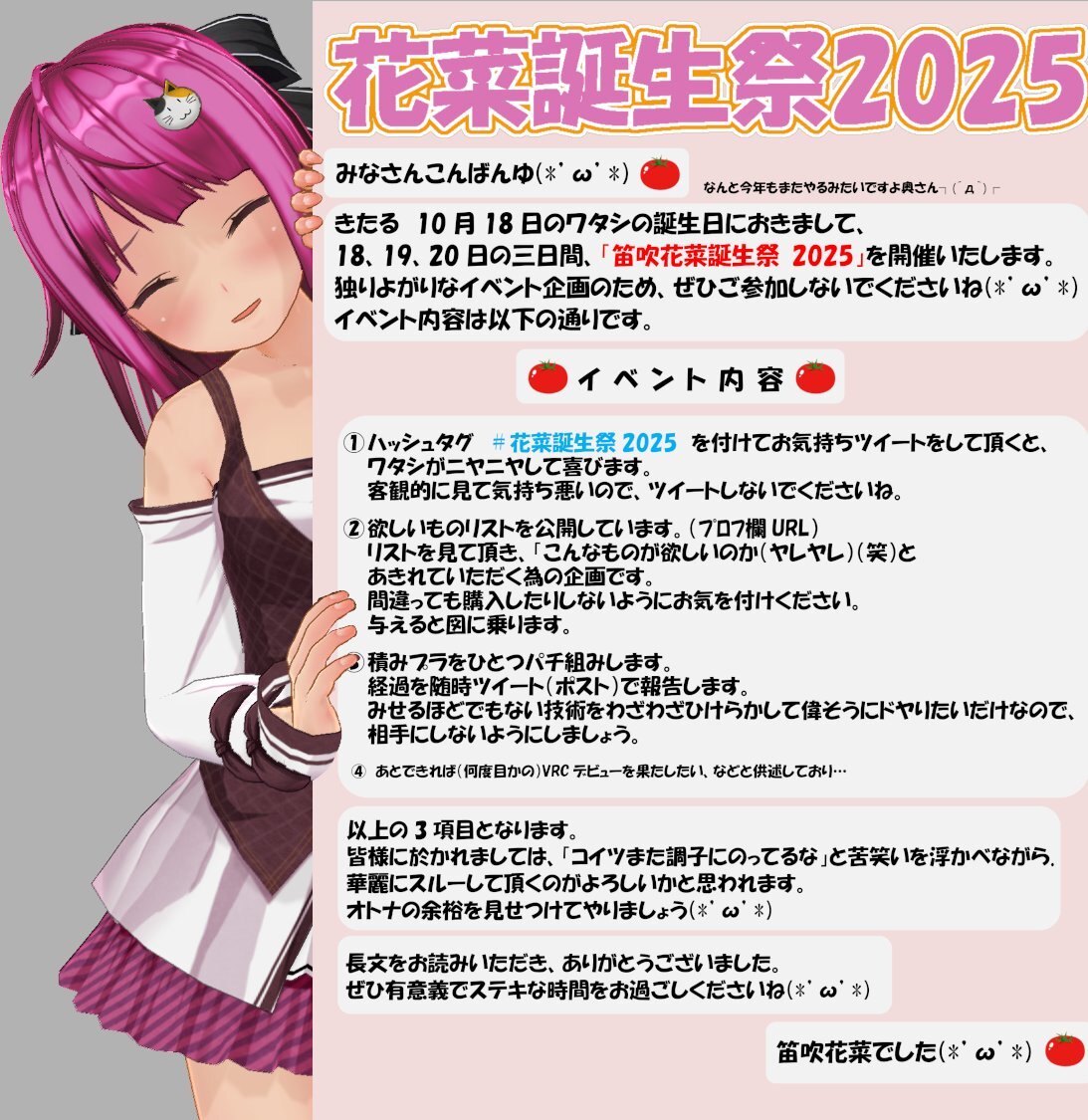 みなさんこんばんゆ(*‘ω‘ *)🍅 さて、いよいよ笛吹花菜誕生祭2025の開幕です! ドンドンパフパフ🥳🍅 まずはパチ組みから開始します🍅 今年はナニを組むのかな? ぜひ当ててみてくださいね(* 'ω' *) ではみなさん、参加しないでね(*´ω`*)🍅 #花菜誕生祭2025 #COM3D2