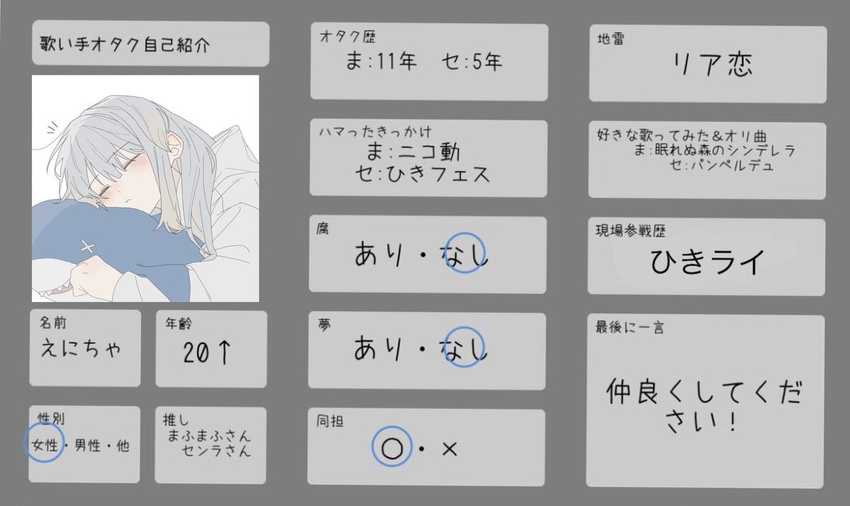 ♡.*・゚┈お友達探し┈゚・*.♡ 天月さんを自分なりに推させて頂いてます💗 行ける時は現場参戦します🎀ིྀ ゆるくながく絡めるお友達ください✊ ひきフェスメンバーのライブもちょこちょこ顔出してます☺️ #歌い手好きと繋がりたい #天月さん好きと繋がりたい #歌い手リスナーさんと繋がりたい