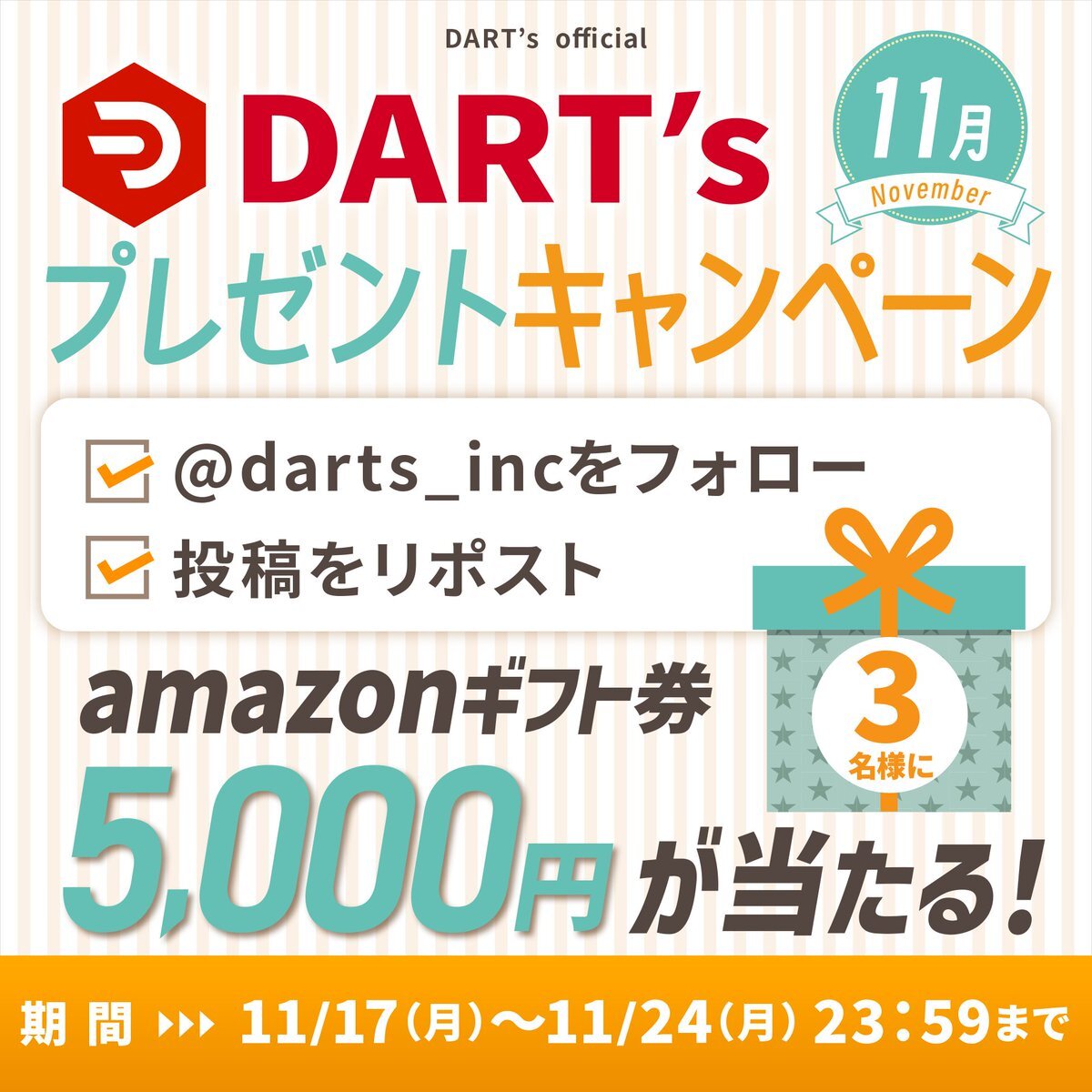 🍂DART’s 11月プレゼントキャンペーン🍂 Amazonギフトカード5,000円分を3名様にプレゼント! 参加方法🪄 ① @darts_inc をフォロー ②この投稿をリポスト 📅期間:11/17(月)~11/24(月)23:59 当選者にはDMでお知らせします🎁