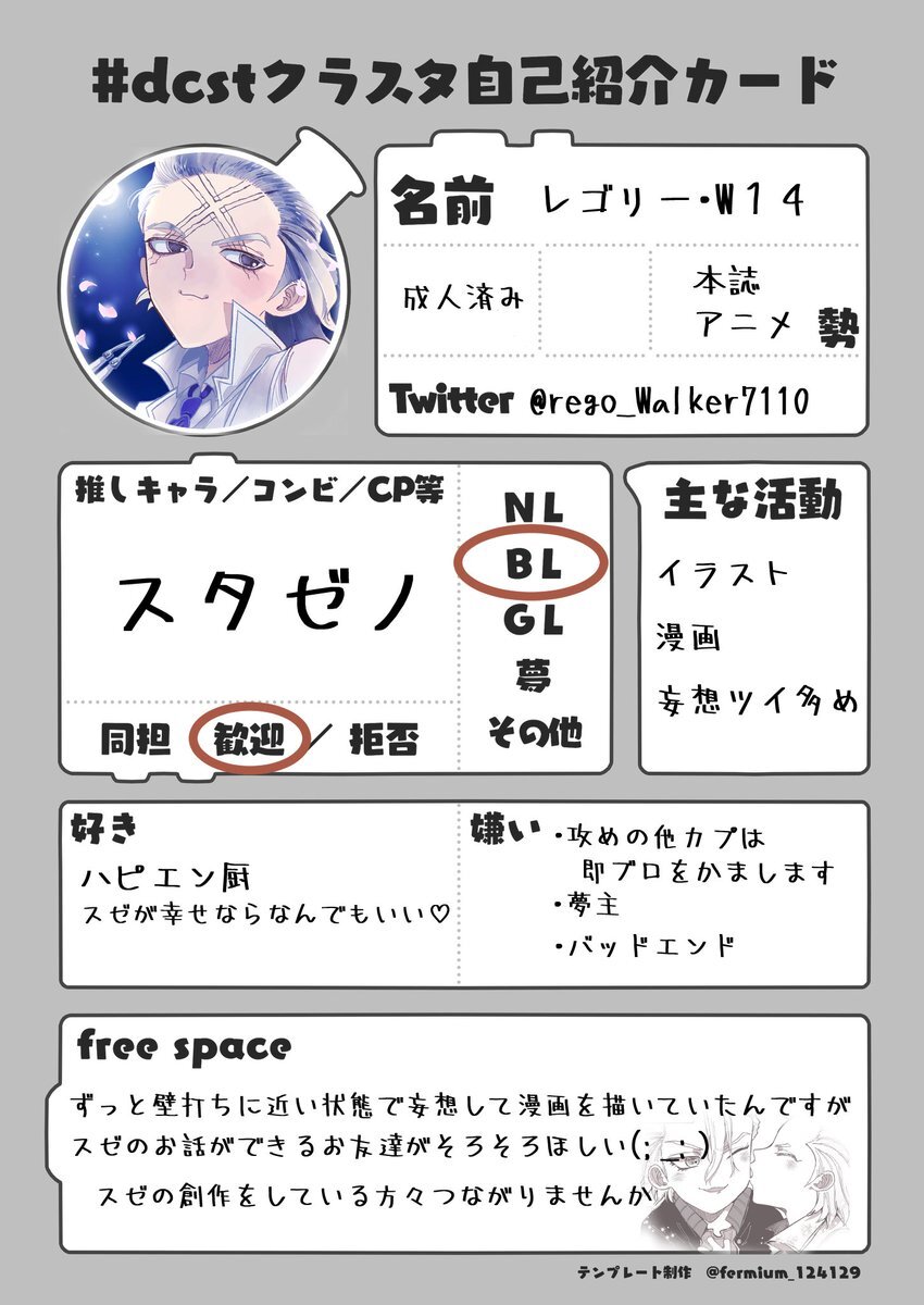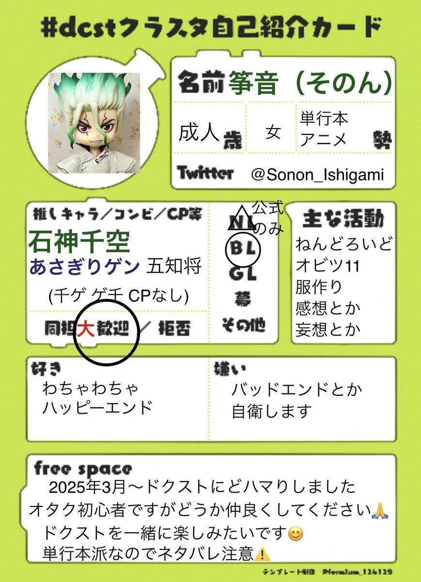 素敵なテンプレお借りしました! 単行本・アニメ派です よろしくお願いします♪ #dcst好きさんと繋がりたい #dcstクラスタさんと繋がりたい #dcstクラスタ自己紹介カード pic.x.com/VcHIAKCs08