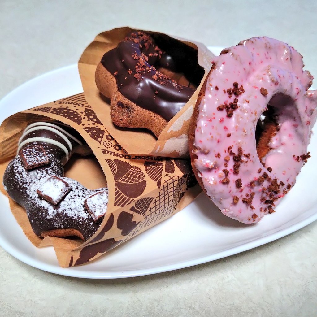 本日のおデザは ミスドのドーナツ🍩 半分ずつ3種食べられた😋 #デザート #おデザ #スイーツ #ミスド #ミスタードーナツ #ドーナツ #donuts #ポンデ生チョコショコラ #ポンデ濃厚ショコラカスタード #ストロベリーファッション pic.x.com/sQ4nO7neDq