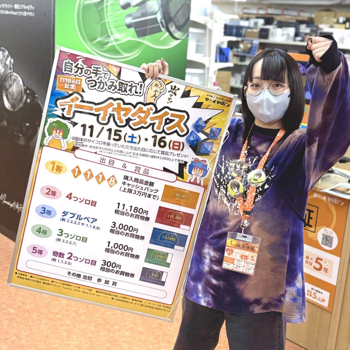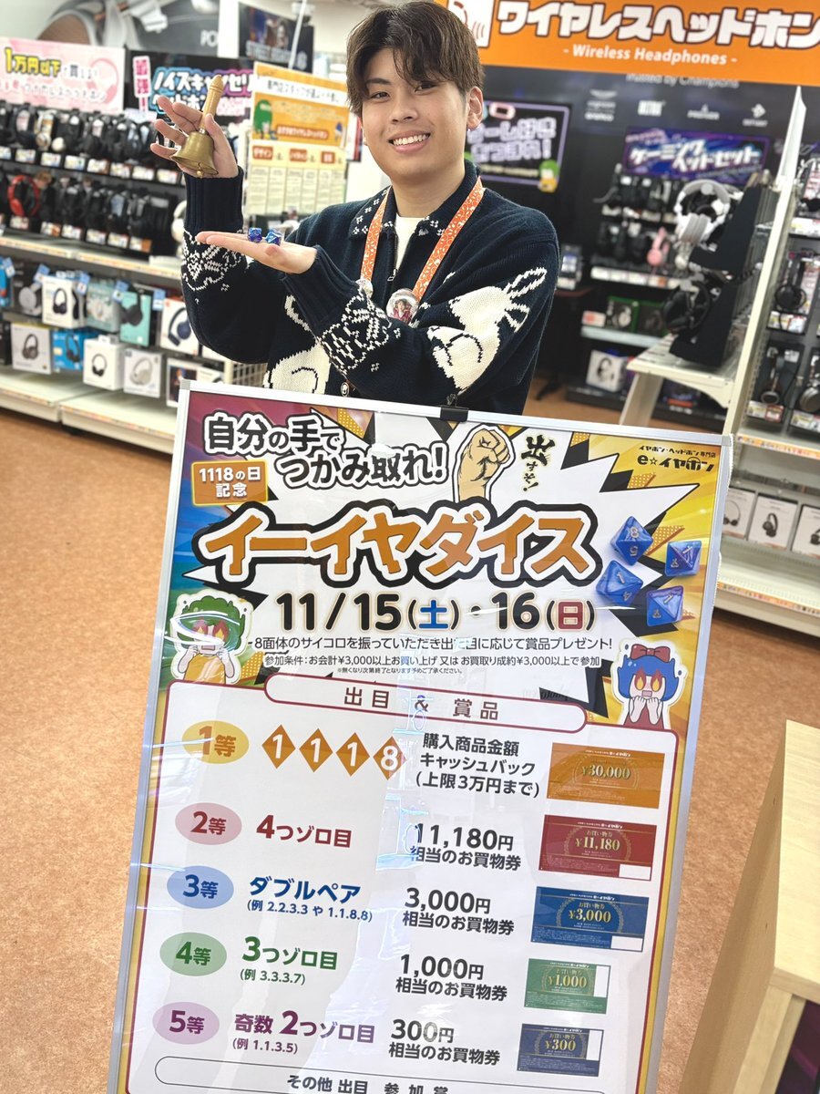 #eイヤ仙台駅前店 #イベント \ 11月18日は『いいイヤホン・ヘッドホンの日』!!/ 明日11/16(日)までイーイヤダイス開催中🎲 🟢お会計¥3,000以上お買い上げ、又はお買取り成約¥3,000以上で参加可能です◎ こちら景品がなくなり次第終了となりますのでお早めに! pic.x.com/OtBAUgLqVP