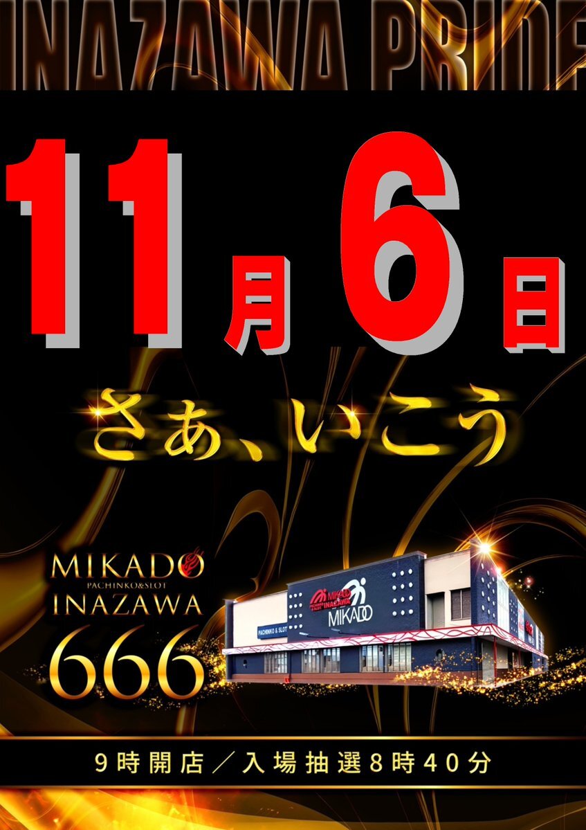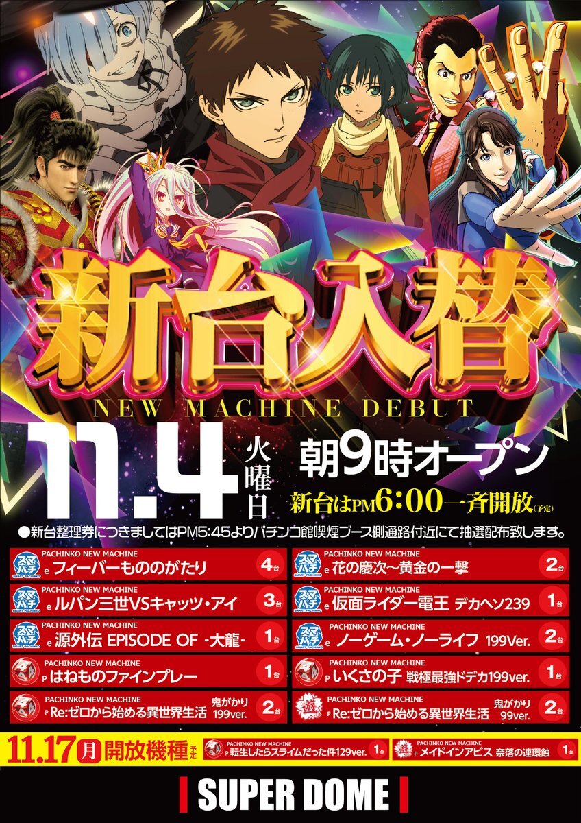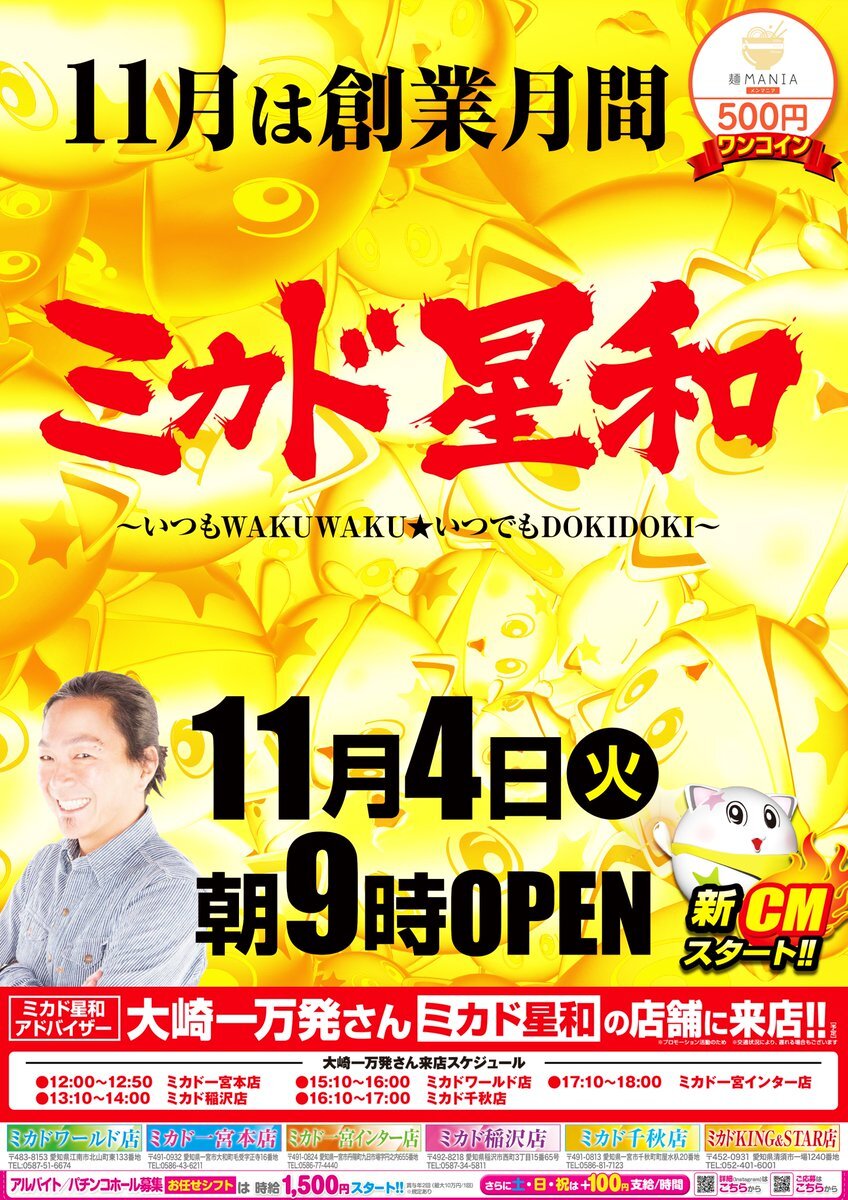 🔥11月は創業月間🔥 ミカド稲沢店からご案内 11月4日(火) 新台入替 大崎一万発さん来店!! クロロえげつない調査隊アニバーサリーS来店 11月4日最新台導入!! #パチスロ革命機ヴァルヴレイヴ2 #eノーゲームノーライフ #eフィーバーもののがたり  ※新台は検査終了後、承認後の開放となります。 pic.x.com/8Y9LqLIM49