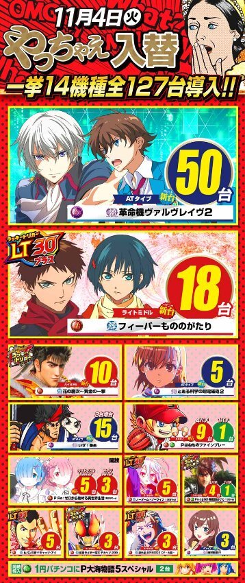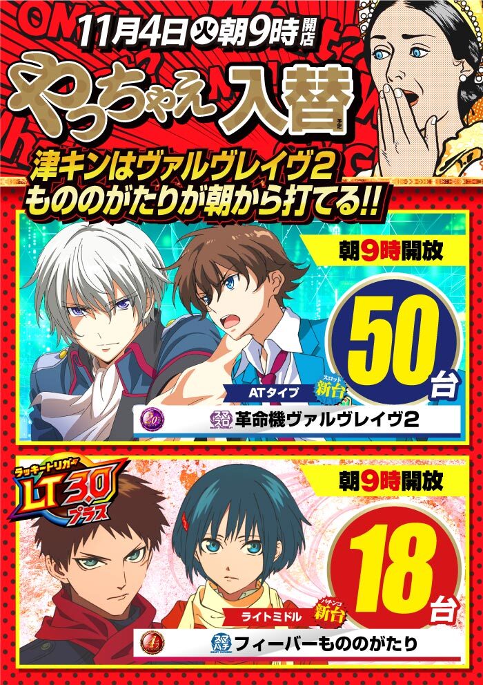 こんばんは🌙 #津キン です🦁 明日11月4日(火)は 🆕🆕🆕🆕🆕🆕🆕🆕   やっちゃえ入替 🆕🆕🆕🆕🆕🆕🆕🆕 🎊🎊話題の新台導入🎊🎊 🎀🎀15機種合計127台🎀🎀 #L革命機ヴァルヴレイヴ2【50台】 #eフィーバーもののがたり【18台】 は朝からご遊技可能! その他にも e花の慶次~黄金の一撃 pic.x.com/6Hwmy6q1Ks