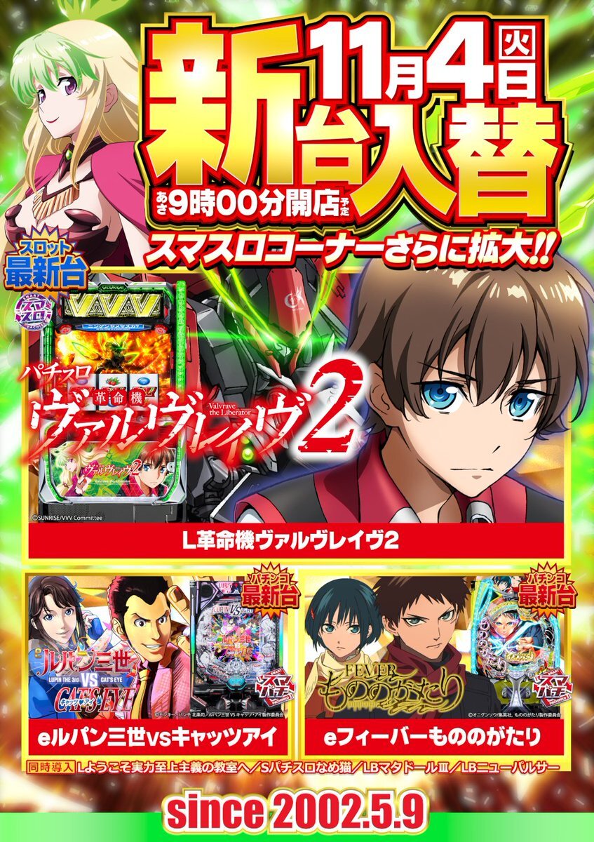 📢本日11月4日(火)✨ 🔥新台入替≪初日≫🔥 ✨ 朝9時オープン ✨ 導入機種 /*━━━━━━━━ #Lヴァルヴレイヴ2 #eフィーバーもののがたり #eルパン三世VSキャッツアイ ━━━━━━━━━━━━━━ 2Fカウンターにて新台整理券をご用意致します🙋‍♂️ご希望のお客様はお早めにご来店ください✨ pic.x.com/E84dg1nB11