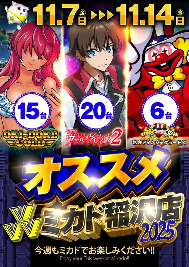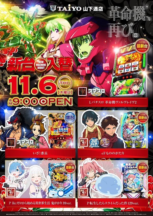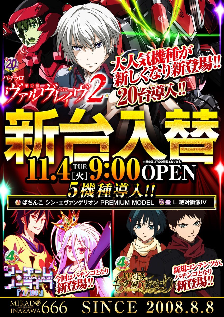 皆さんこんばんは、ミカド稲沢店です。 11月は創業月間!! 三連休最終日もミカド稲沢店へ!! 11月より㊗新CM放送中㊗ 🔥11月4日導入予定🔥 #パチスロ革命機ヴァルヴレイヴ2 🤖 #eノーゲームノーライフ 🎮 #eフィーバーもののがたり 👻 pic.x.com/7uY3hwJJ2n