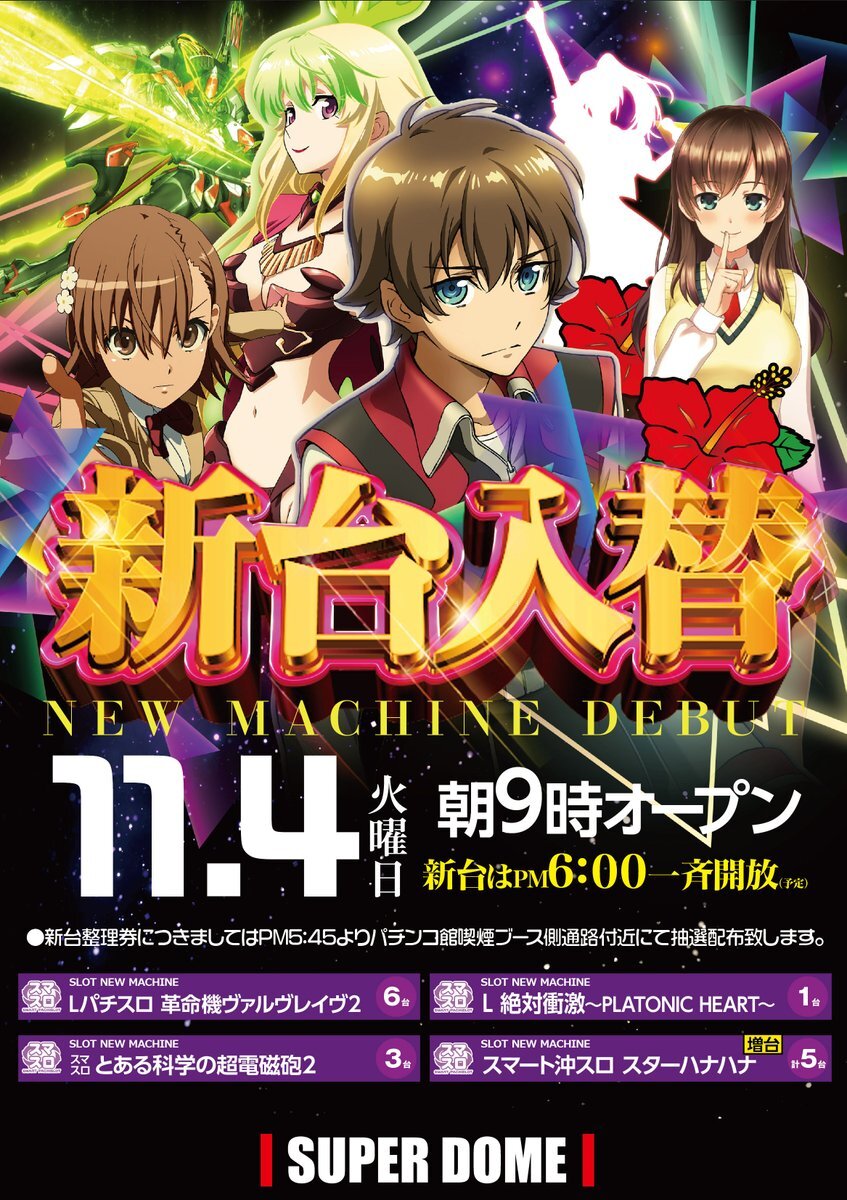🎊1⃣1⃣月4⃣日🎊 🌈#新台入替 🌈 🟢パチンコ🟢 #e花の慶次~黄金の一撃 #eフィーバーもののがたり #Pいくさの子戦極最強 🔴スロット🔴 #L革命機ヴァルヴレイヴ2 #Lとある科学の超電磁砲2 #L絶対衝激フォース 新台抽選は11:30からです👍 是非最新台は #アビバ で‼️‼️ pic.x.com/GOBWLKEpeG