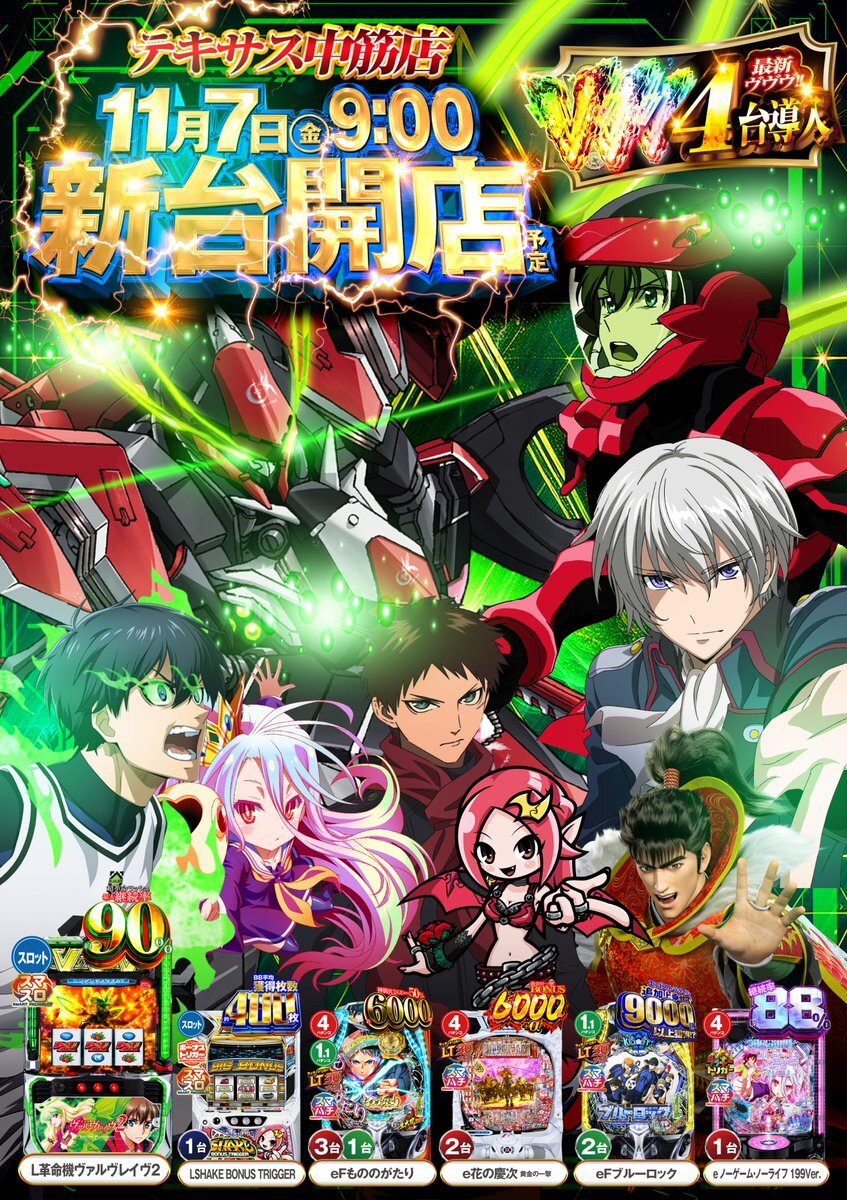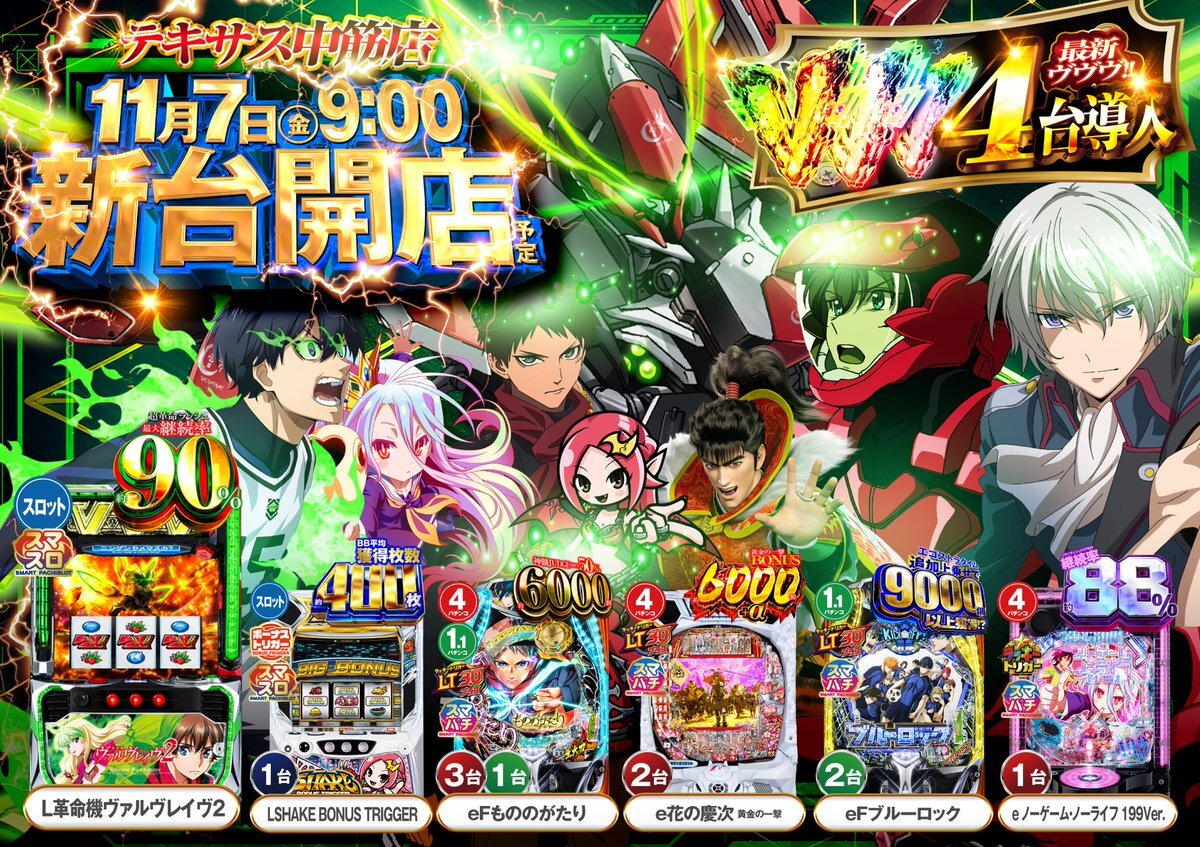 #テキサス中筋店 です! 本日1⃣1⃣月7⃣日(金) 🌈全館9時開店🌈 🌈☆新☆台☆開☆店☆🌈 #Lヴヴヴ2 #BTシェイク #e慶次 #eもののがたり #eノゲノラ etc. 👆新たな【推】を見つけ出せ!👆 👇要注目👇 👊#北斗の拳 #沖ドキGOLD🌺 🔥1⃣1⃣月圧倒的TEXASへ!🔥 ご来店お待ちしております😁 pic.x.com/N22IpvXPh8