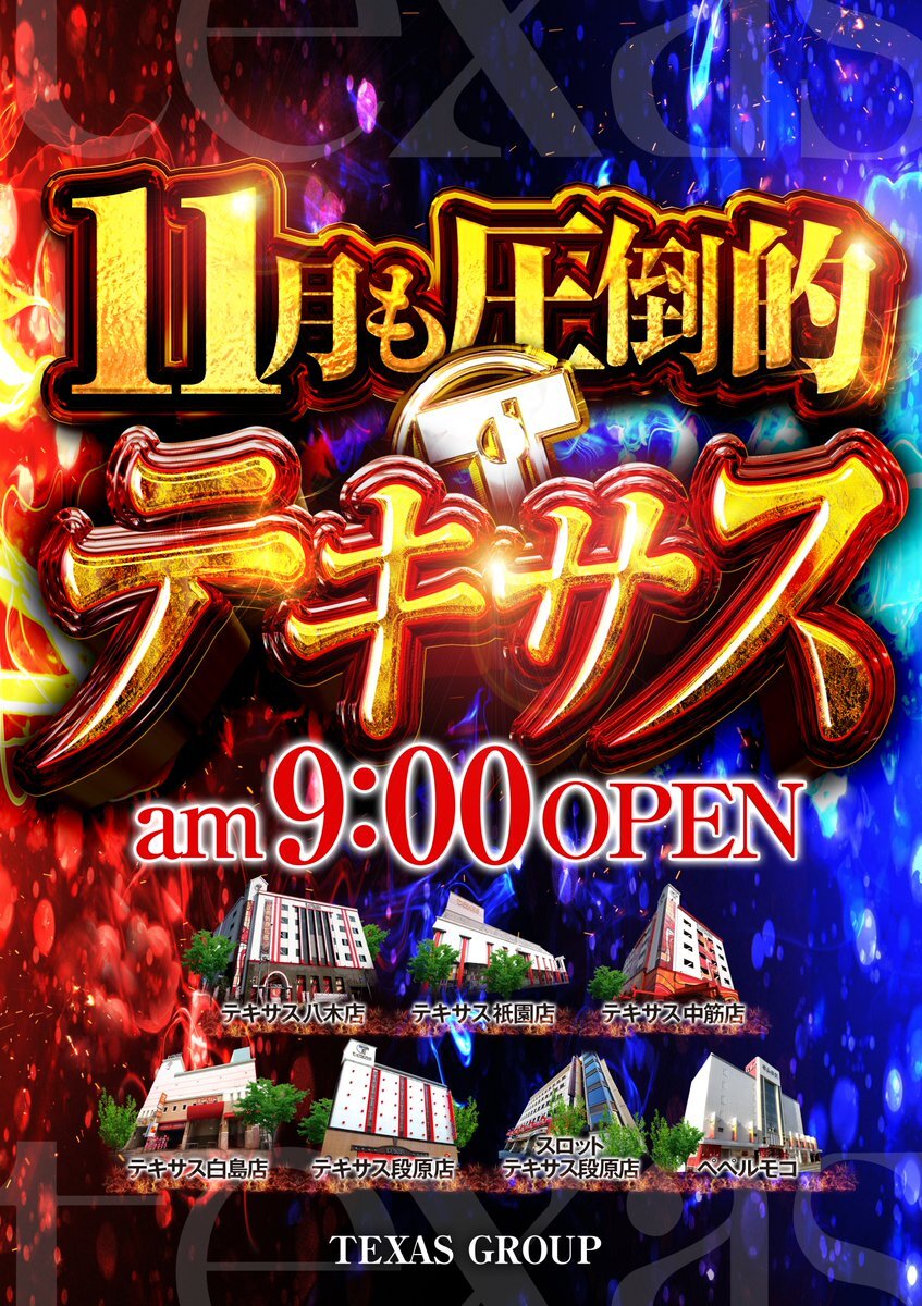 🌈1⃣1⃣月は圧倒的TEXAS🌈 #テキサス中筋店 です‼ 🌈明日1⃣1⃣月1⃣1⃣日(火)🌈 🌈全館9時開店🌈 ⏰入場抽選8:30~⏰ 🔥新台好評稼働中🔥 #Lヴヴヴ2 #Lシェイク #e慶次 #eもののがたり etc. 1⃣1⃣日の主役は『中テキ』👍 これは・・!行くっきゃない🌈 皆様のご来店お待ちしております👯‍♂️ pic.x.com/vQKjyfQusG