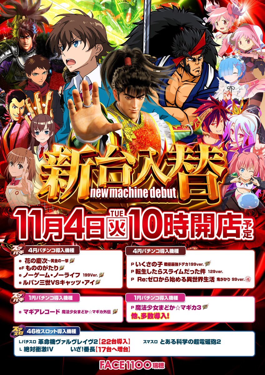 ☁おはようございます🌞 本日11月4日の #フェイス瑞穂 は・・・ 🆕フェイス瑞穂11月の新台入替だぁ‼🆕 #e花の慶次黄金の一撃 超RUSH時 継続率77%当選時50%で・・6000発‼ #eもののがたり ライト×6000発!?神髄ジャッジ発生の50%で6000発‼ #eノーゲーム・ノーライフ 199ver. pic.x.com/tfdOe0hg85