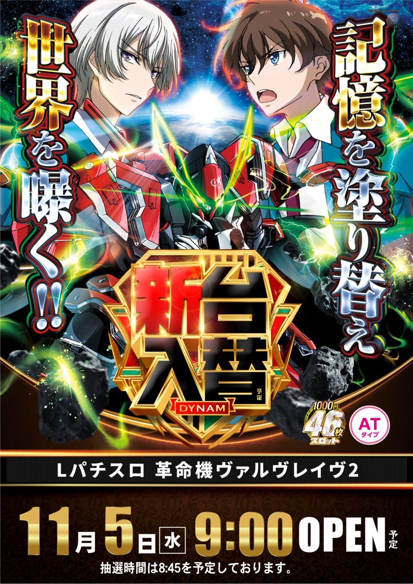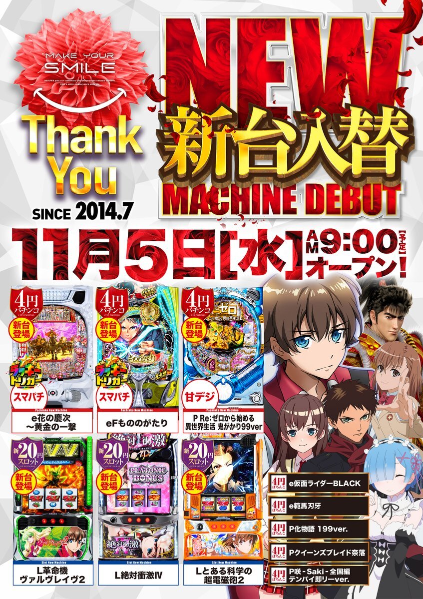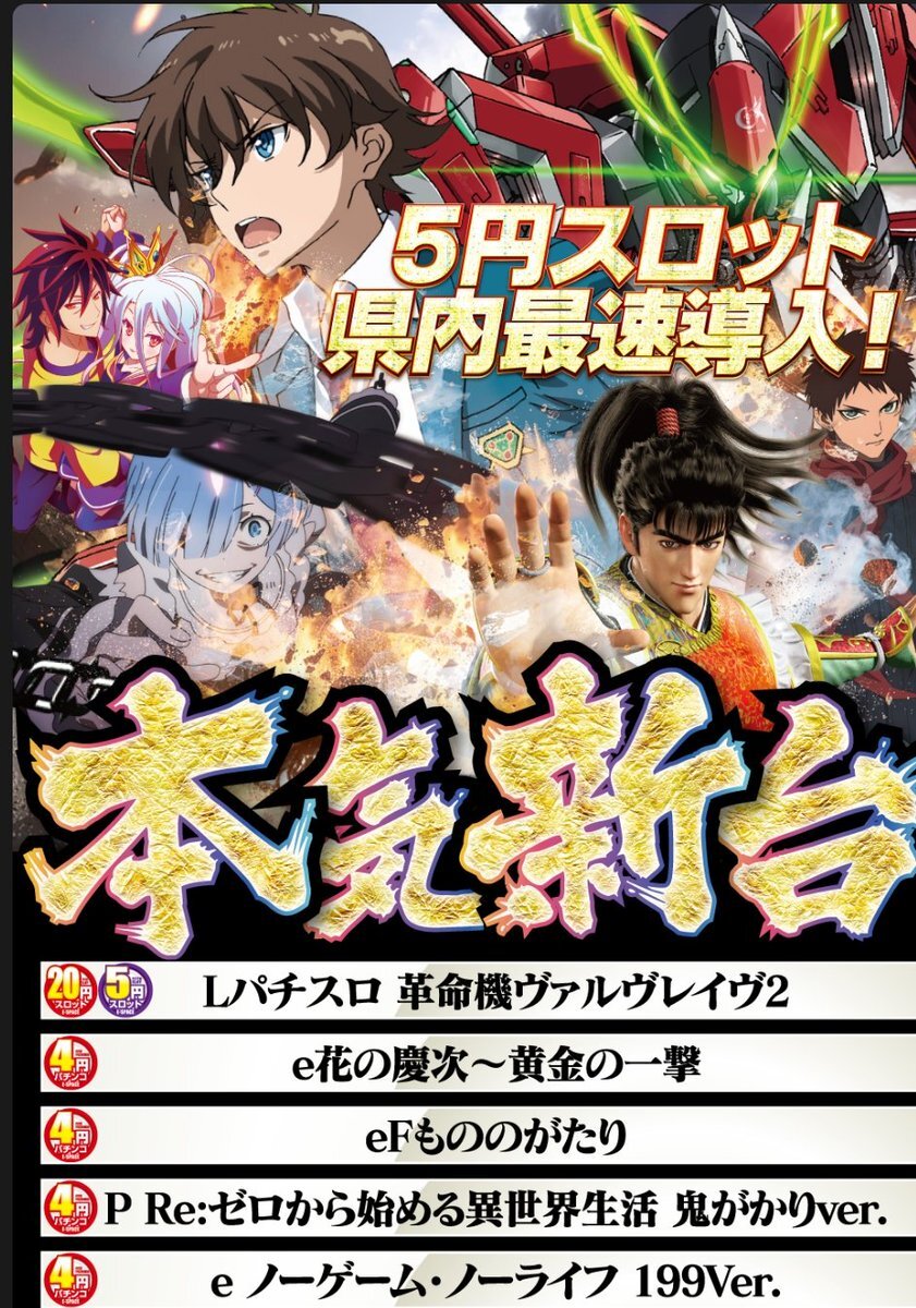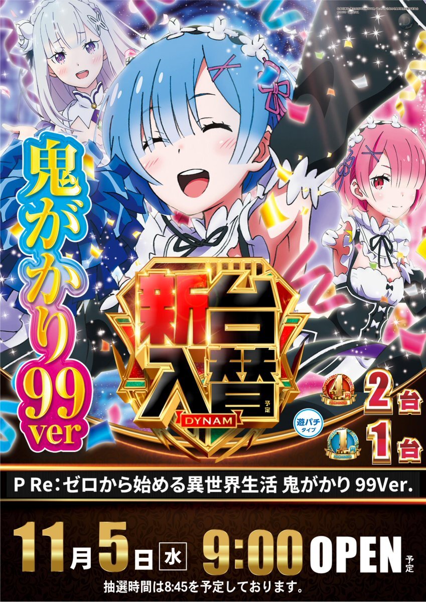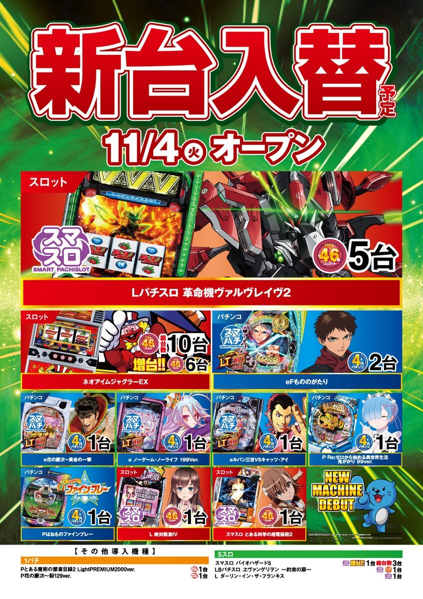 11月5日【水】 『🌟新台入替🌟』 導入機種ご案内👏 4円P #リゼロ鬼がかり99ver⇒なんと1円Pにも導入します🔥 #e花の慶次黄金の一撃 #eFもののがたり #P真北斗無双4下剋上闘 1円P #eブルーロック 20円S #L絶対衝激4 #L革命機ヴァルヴレイヴ2 抽選は8:45スタートです📢 #ダイナム pic.x.com/V398SWgw2V