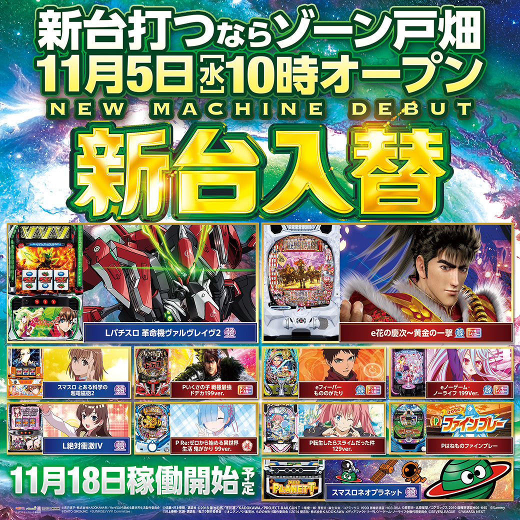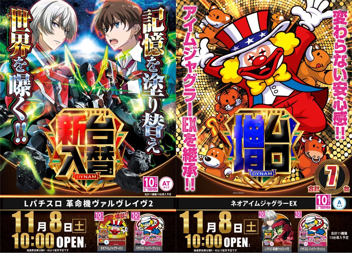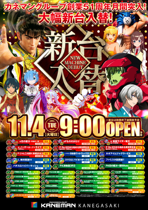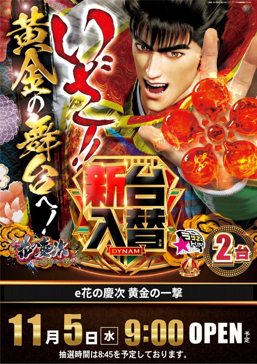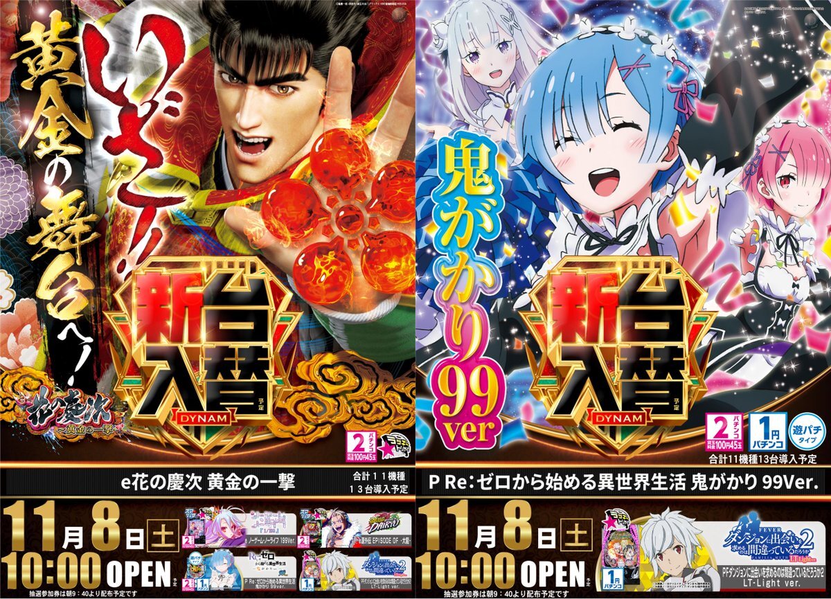 11月5日【水】 『🌟新台入替🌟』 導入機種ご案内👏 4円P #リゼロ鬼がかり99ver⇒なんと1円Pにも導入します🔥 #e花の慶次黄金の一撃 #eFもののがたり #P真北斗無双4下剋上闘 1円P #eブルーロック 20円S #L絶対衝激4 #L革命機ヴァルヴレイヴ2 抽選は8:45スタートです📢 #ダイナム pic.x.com/V398SWgw2V