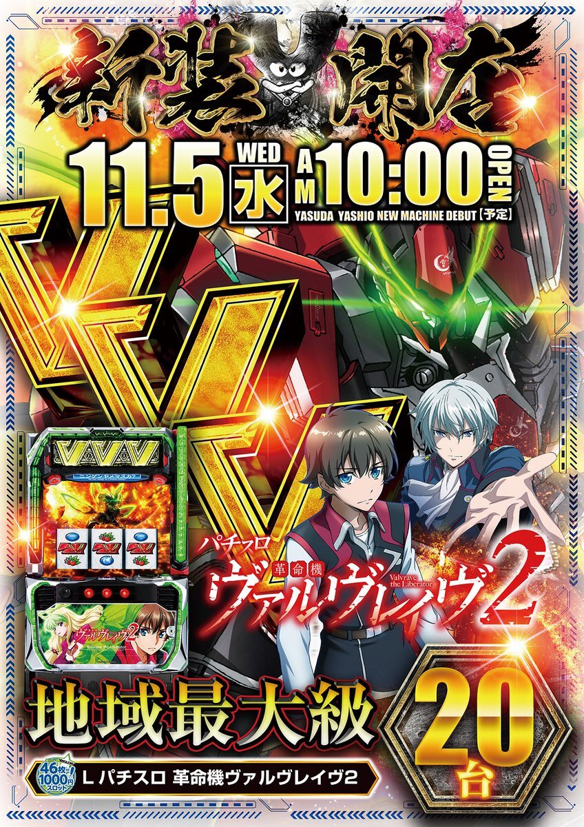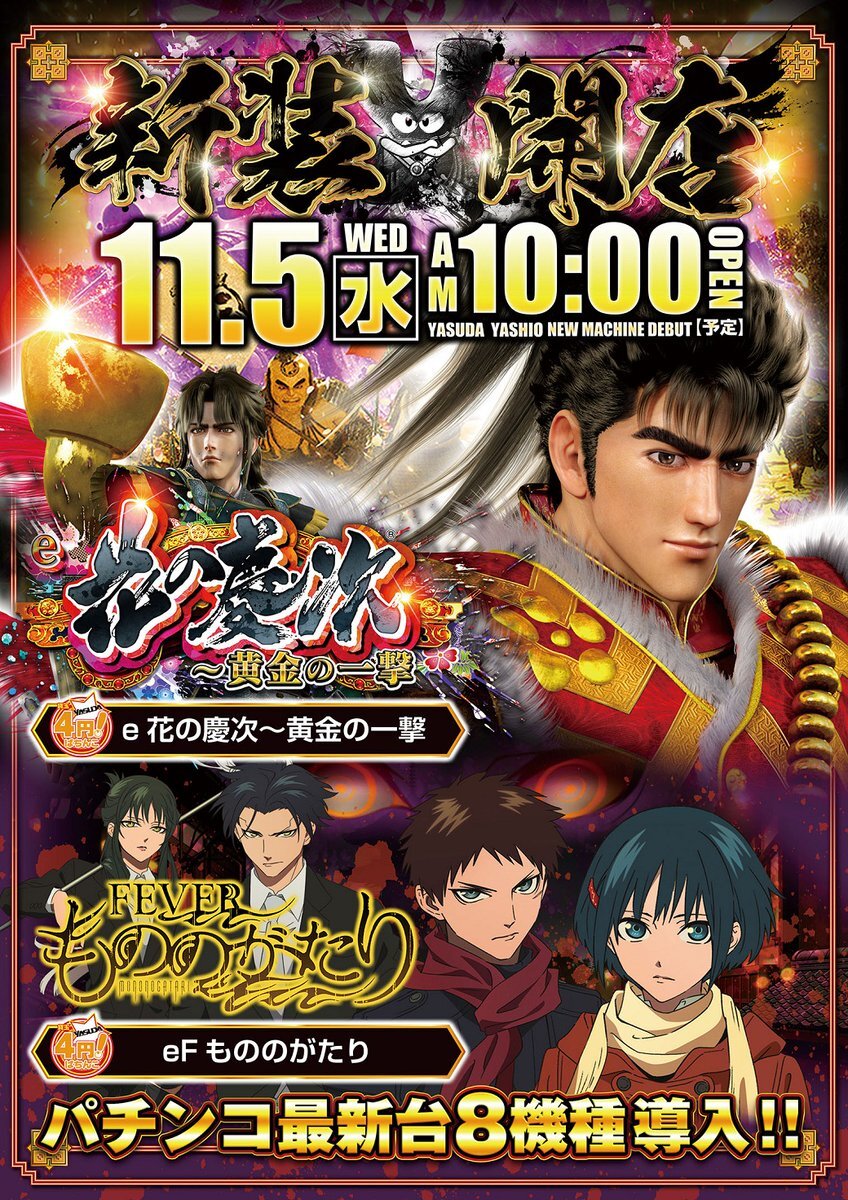 やすだ八潮店 です‼️ 1⃣1⃣月5⃣日【10時開店】 🎉やすだの新装🎉 タイボウノサイシンサクデスカ #パチスロヴァルヴレイヴ2 2⃣1⃣台 いざ!番長 ✊漢の増台 1⃣0⃣台 eF #もののがたり 15台 #e花の慶次黄金の一撃 など最新一挙12機種!! #あおばさち さん来店💓 @777aoba777 モリダクサンデスネ pic.x.com/jFfdZQLPkd