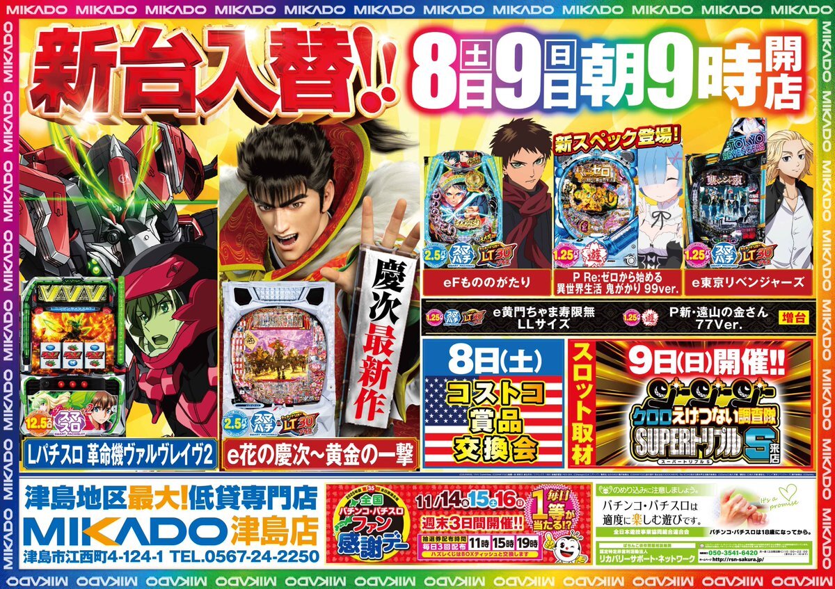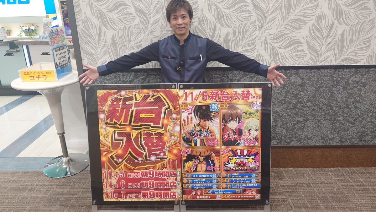 11月8日(土) ✨新台入替✨ 10:00開店(予定) 久しぶりに土曜日の #新台入替 となります😄 多くのお客様のご来店が予想されます。 お早目にご来店下さい🤩 #Lヴァルヴレイヴ2 #e花の慶次黄金の一撃 #Pリゼロ鬼がかり99 他計11機種13台導入予定 ⏩抽選時間 9:50~ #ダイナム #福津 pic.x.com/1vjq3UZ4RQ