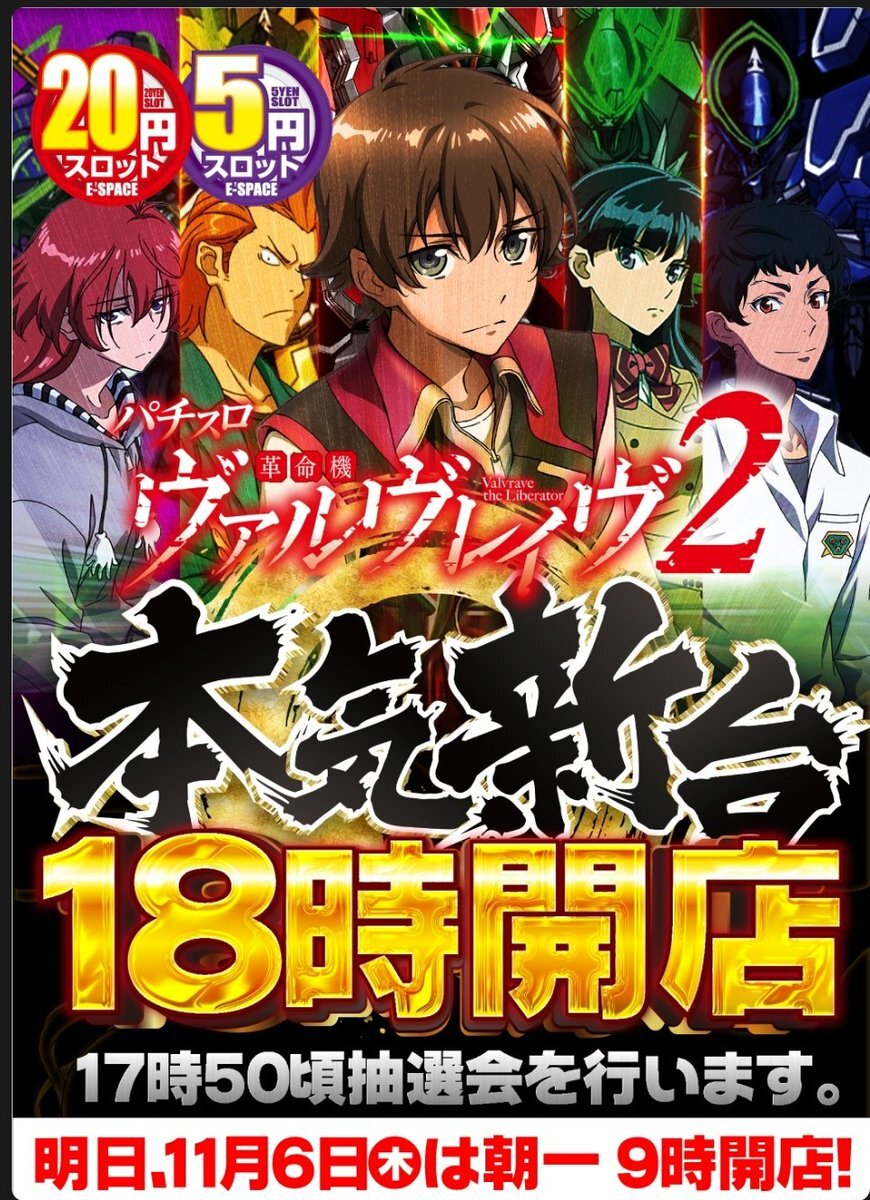 ―NEW MACHINE DEBUT――― 11月4日【火曜日】 新台入替17時OPEN(予定) ―――――――――――――― 話題の最新機種多数導入‼ 🆕eFもののがたり 🆕e花の慶次~黄金の一撃~ 🆕L革命機ヴァルヴレイヴ2 など他にも最新・人気機種多数導入🤗 ⏬入場のご案内⏬ ⏰入場抽選 16:45 ⏰再整列 16:50