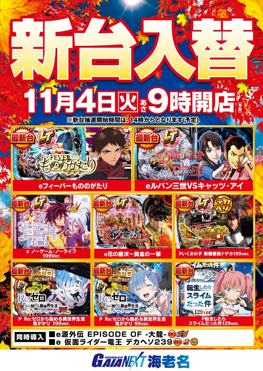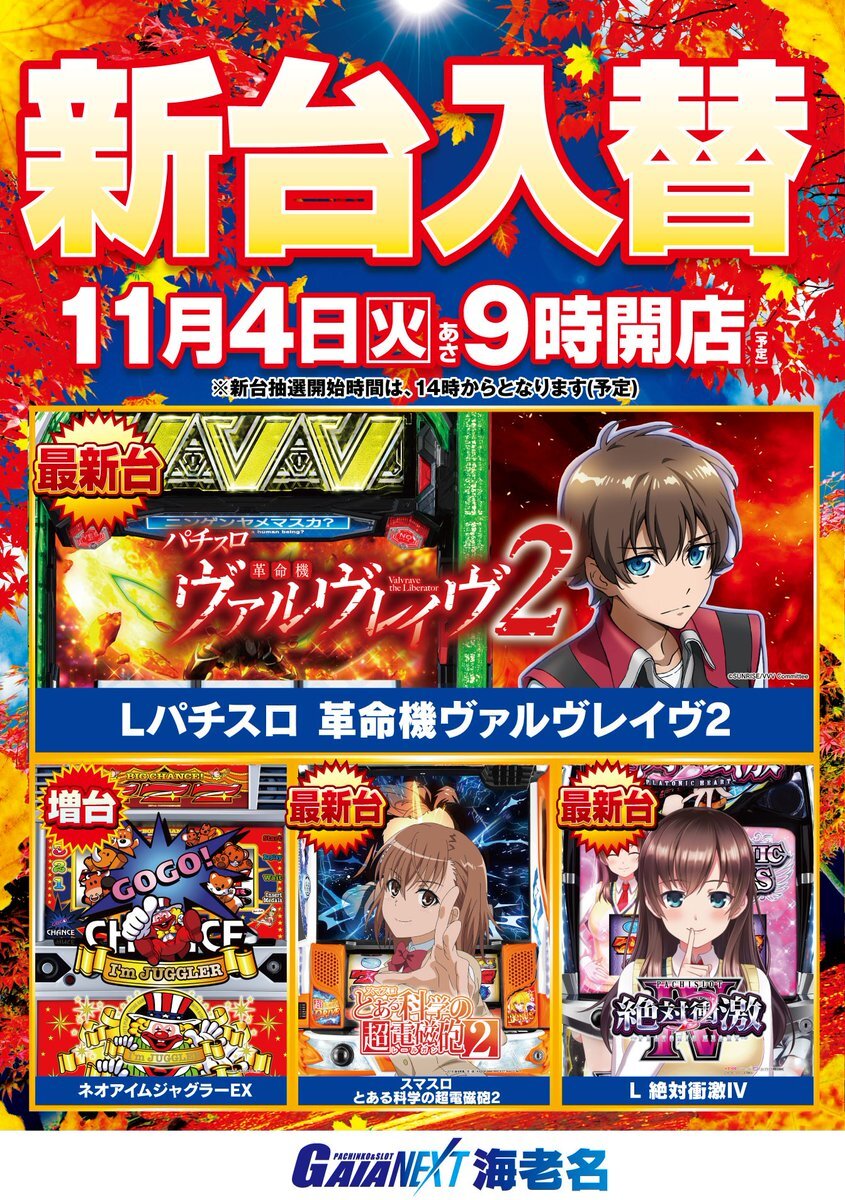 ガイアネクスト海老名駅前店 #サキちゃん です🩷 11月4日(火) 新台入替 🚩入場抽選は8時40分🚩 🆕最新機種🆕 #eもののがたり #eルパン三世VSキャッツアイ #e花の慶次黄金の一撃 #Lヴァルヴレイヴ2 #Lネオアイムジャグラー #増台 その他にも最新台多数導入🔥 新台抽選は14時スタート🚩 pic.x.com/xgc3j17O3s
