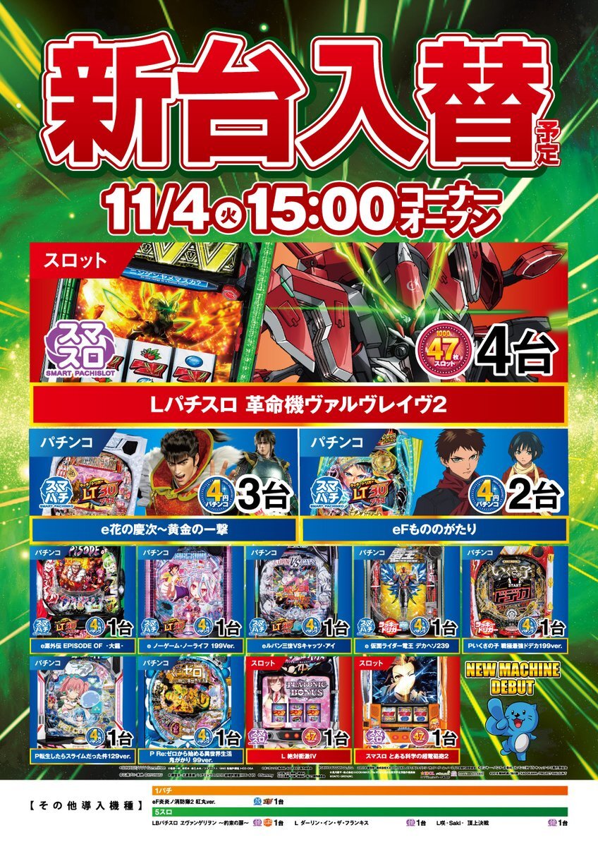 明日11月4日(火)は #新台入替 デス‼️ パチンコは #e花の慶次~黄金の一撃H4 (3台)を筆頭に10機種13台が仲間入り‼️ スロット #L革命機ヴァルヴレイヴ2 (4台)を筆頭に6機種9台入替‼️ ⚠️新台は15時コーナーオープン‼️ ⚠️店内アナウンスで先着順により整理券を配布致します #ニラク白根店 pic.x.com/2M9ALQfHhP