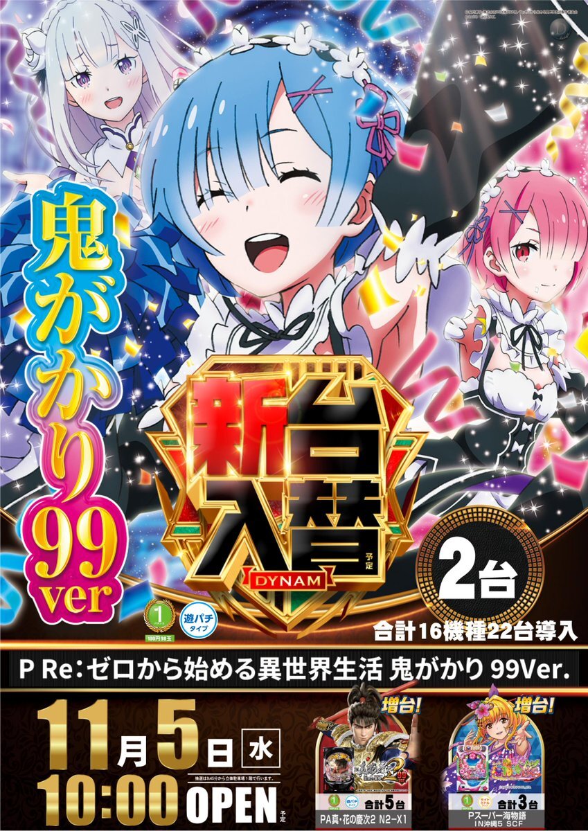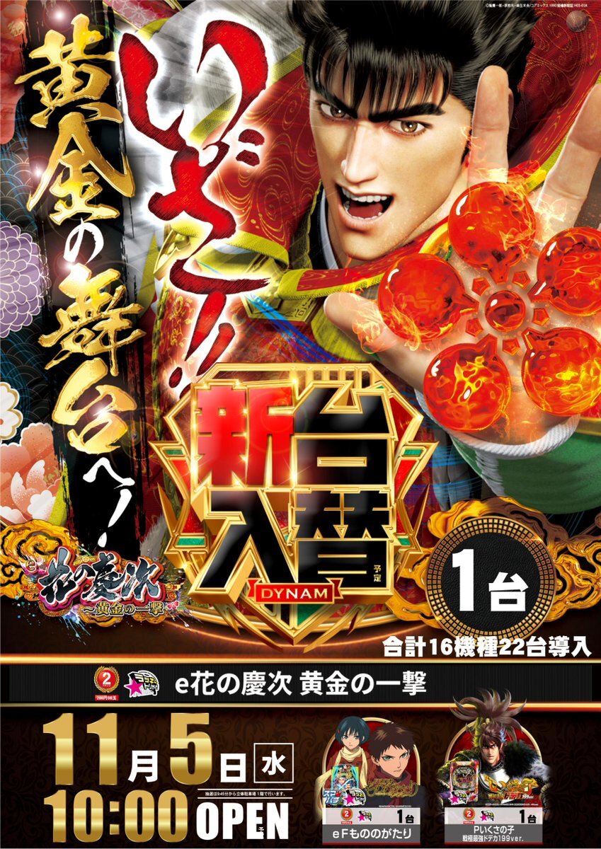 【お知らせ】 💗11月5日(水) 10:00開店(予定)💗 『1円パチンコ』 #PReゼロ鬼がかり99A03 #Pいくさの子戦極最強GRPJ 『2円パチンコ』 #eもののがたりF #e花の慶次~黄金の一撃H4 🍀ご来店お待ちしてます🍀 #ダイナム #新台入替 pic.x.com/yt9xaSrtS2