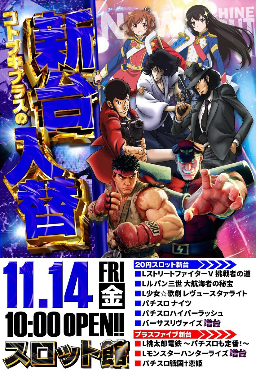 おはようございます #コトブキプラス三芳店 です 11月14日 全館10:00 OPEN #新装開店初日 スロット館⇒最新機種 #Lストリートファイター5 #Lレヴュースタァライト #Lルパン三世大航海者の秘宝 当店自慢のAタイプ #ナイツ #ハイパーラッシュ パチンコ館⇒ #e超電磁砲 #e炎炎2紅丸 ご来店お待ちしてます pic.x.com/JJeSrqcTEg