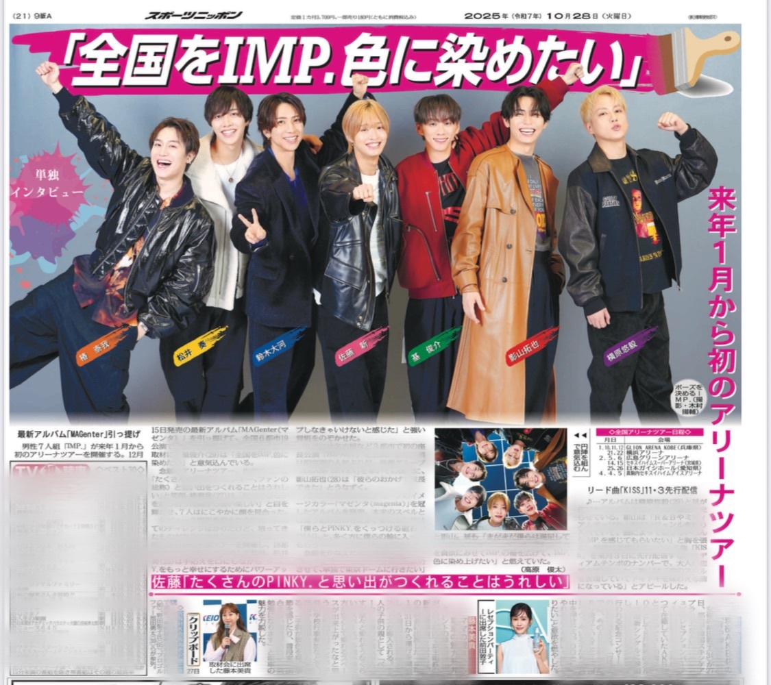 / きょう28日のスポニチにIMP.(@_7mp_official )登場! \ 初アリーナツアー開催発表した7人がスポニチの独占取材に応じてくれました📰 ✅激動の2025年の振り返り ✅ツアーへの期待 ✅最新AL💿のタイトル命名は椿泰我!? 📷紙面いっぱいに広がるスポニチ独占ショットはお近くのコンビニなどで!