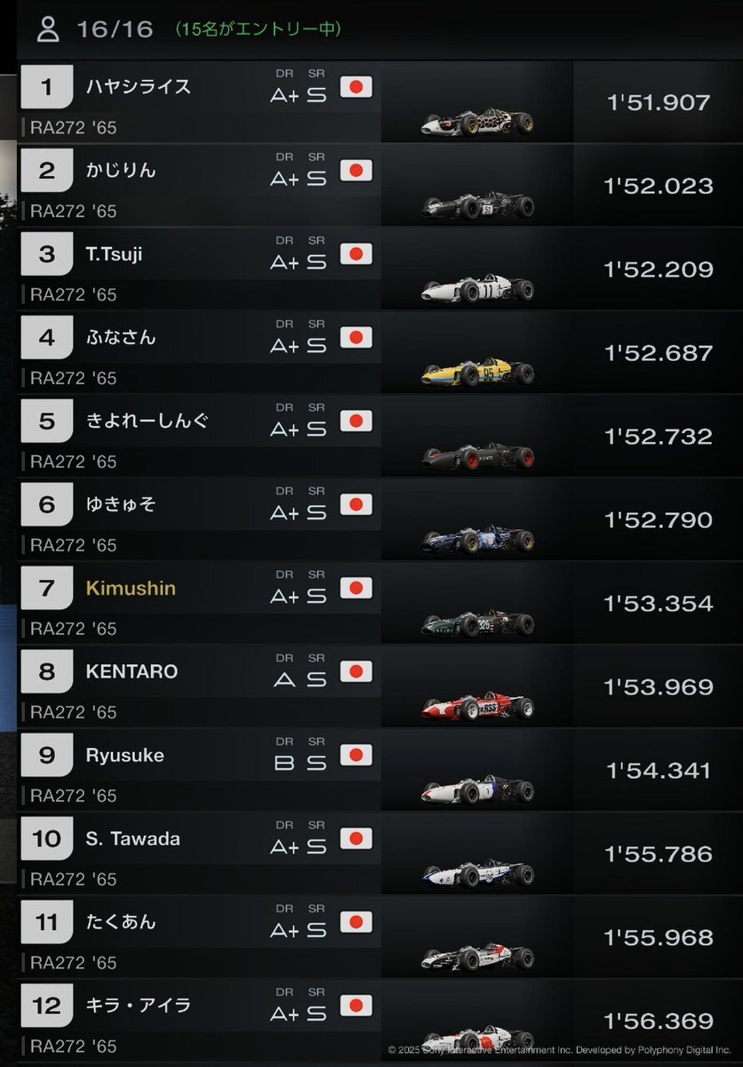 今回セッティング可なのでマネージャー業務でセッティング作成しましたw ABS禁止なのでブレーキめっちゃ難しいですね😎 RA272はリヤのサスペンションの動きが見れておもろいw x.com/e_DGmotorsport…